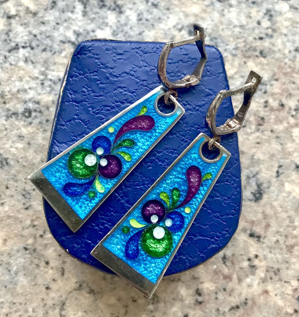 Серьги в технике минанкари (перегородчатая эмаль), основа из серебра 925пр. Высота серьги 4,5см., подвеска в виде трапеции высотой 3,5см., ширина от 0,7см. до 1,5см. у основания. Вес 9гр. Состояние хорошее.
