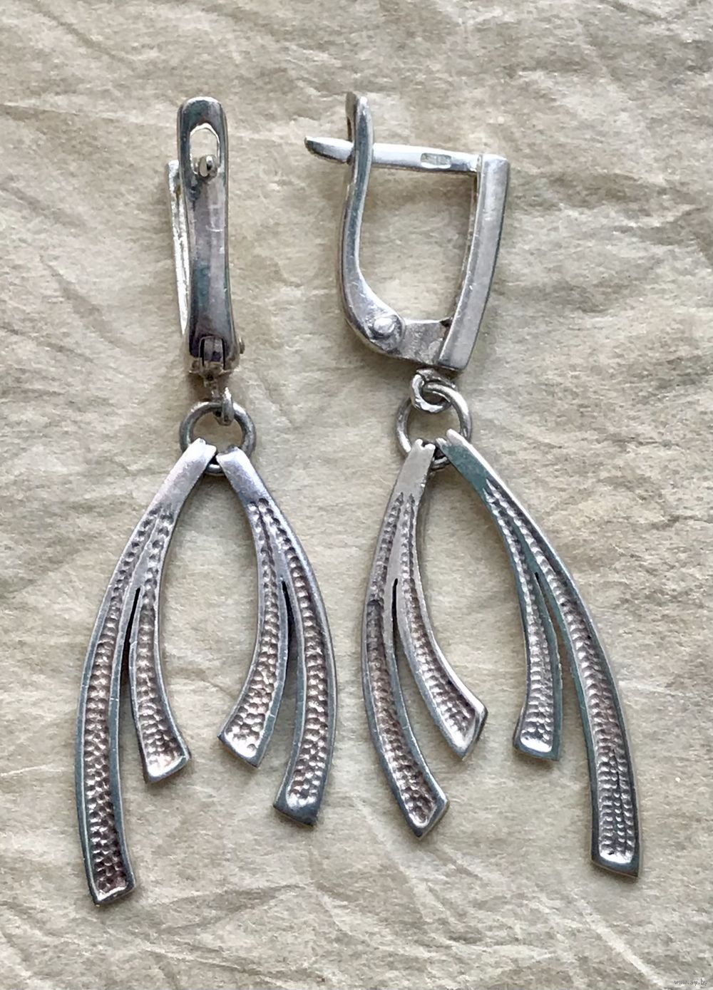 Серьги из серебра 925пр.(на каждой стоит отметка 925 и пробирное клеймо с зубром). Высота серьги 4,7см., вес пары 7,64гр. Состояние хорошее.
