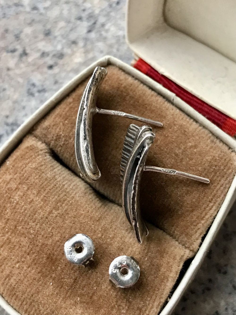 Серьги из серебра 925пр.(отметка 925 стоит на заглушках и не очень отчётливо на штифте каждой серьги). Размер серьги 1,8х1,1см. Состояние хорошее.