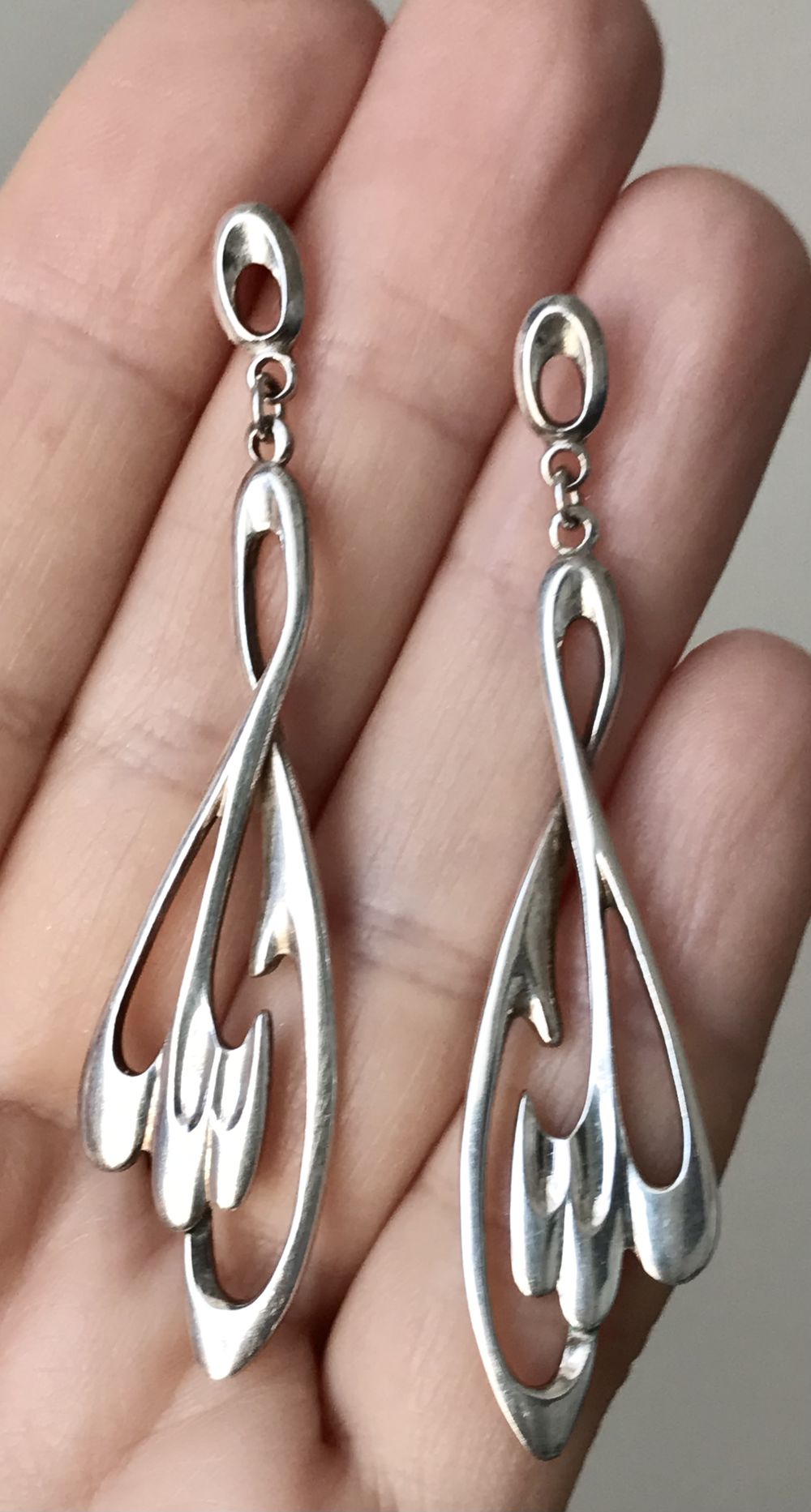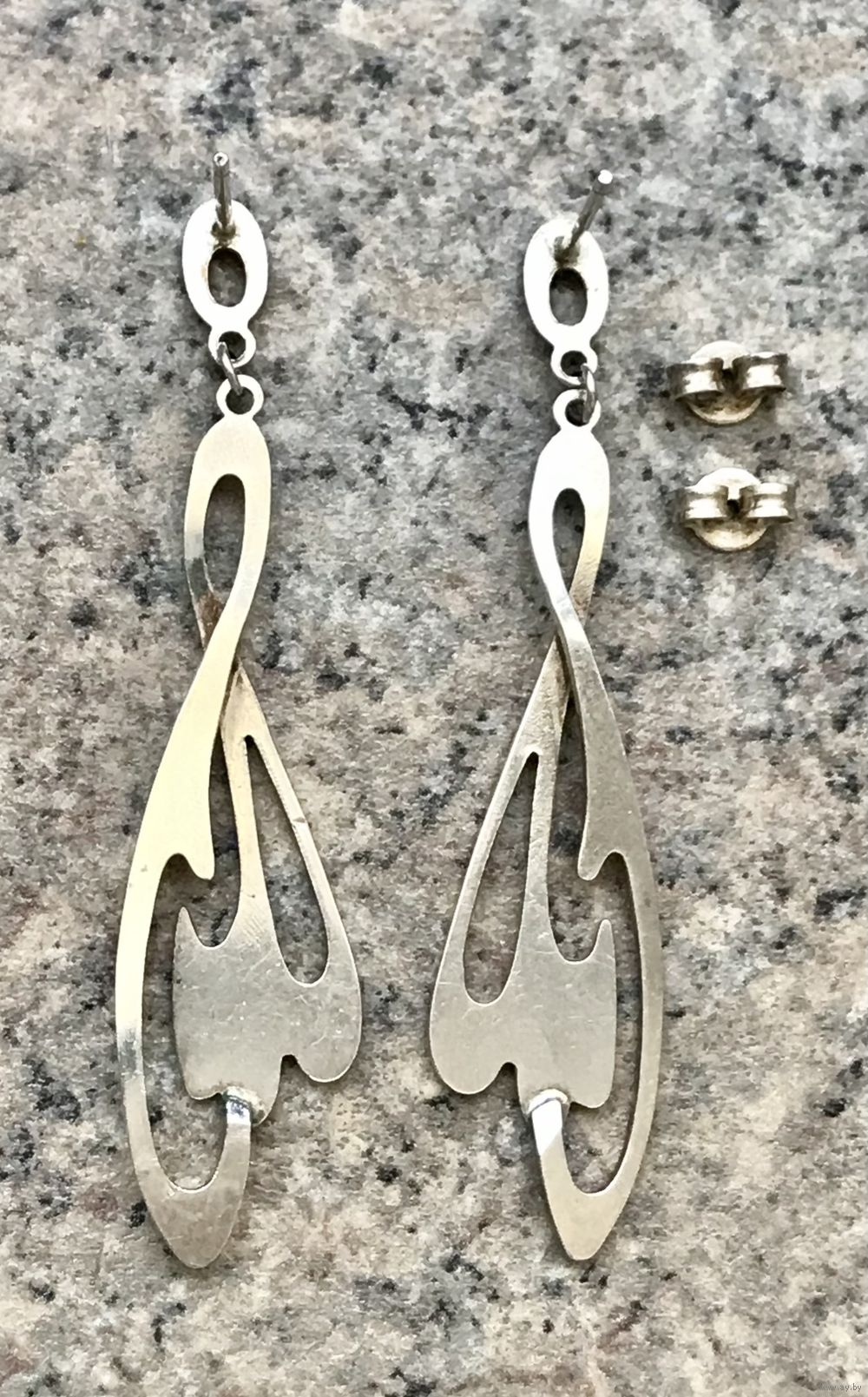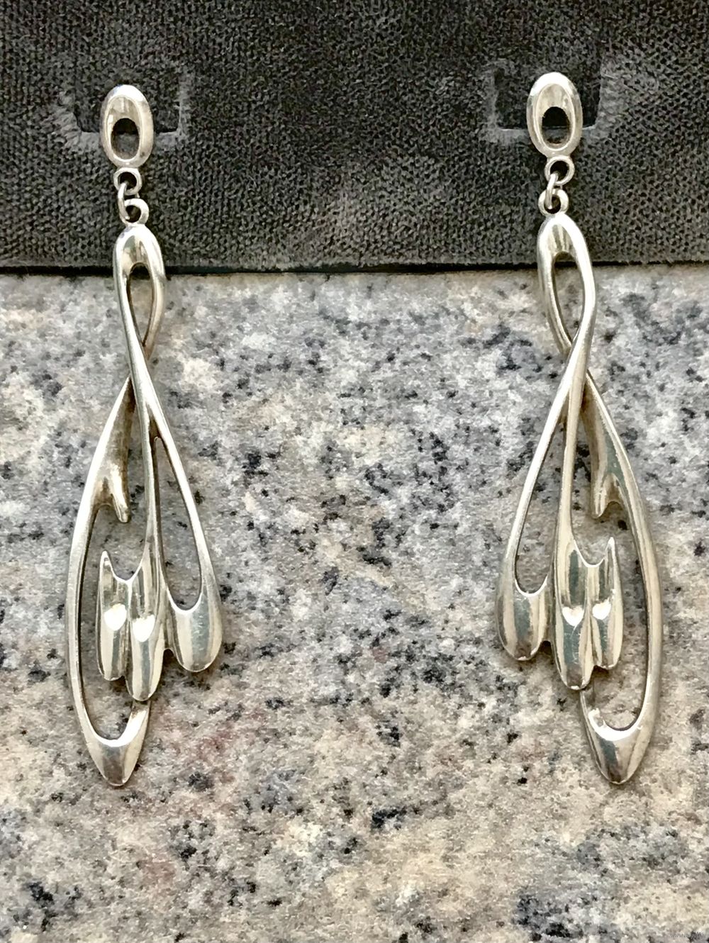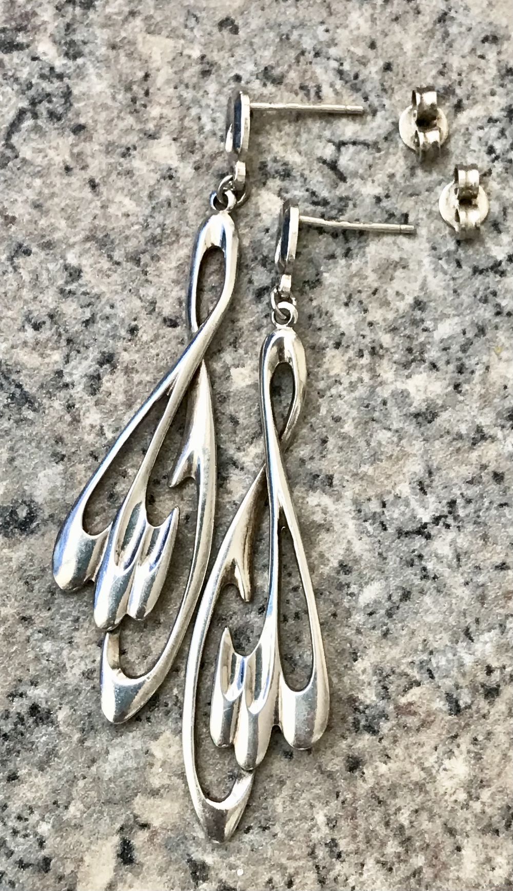 Серьги-пусеты из серебра 925пр.(звезда). Сделаны в 1991г. в Таллине, автор модели Тамара Сергиенко. Высота серьги 6,5см., вес пары 7,75гр. Состояние хорошее.