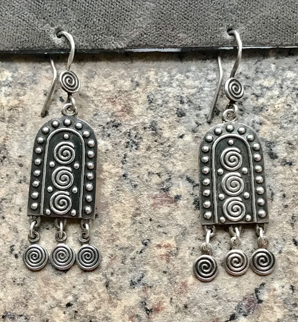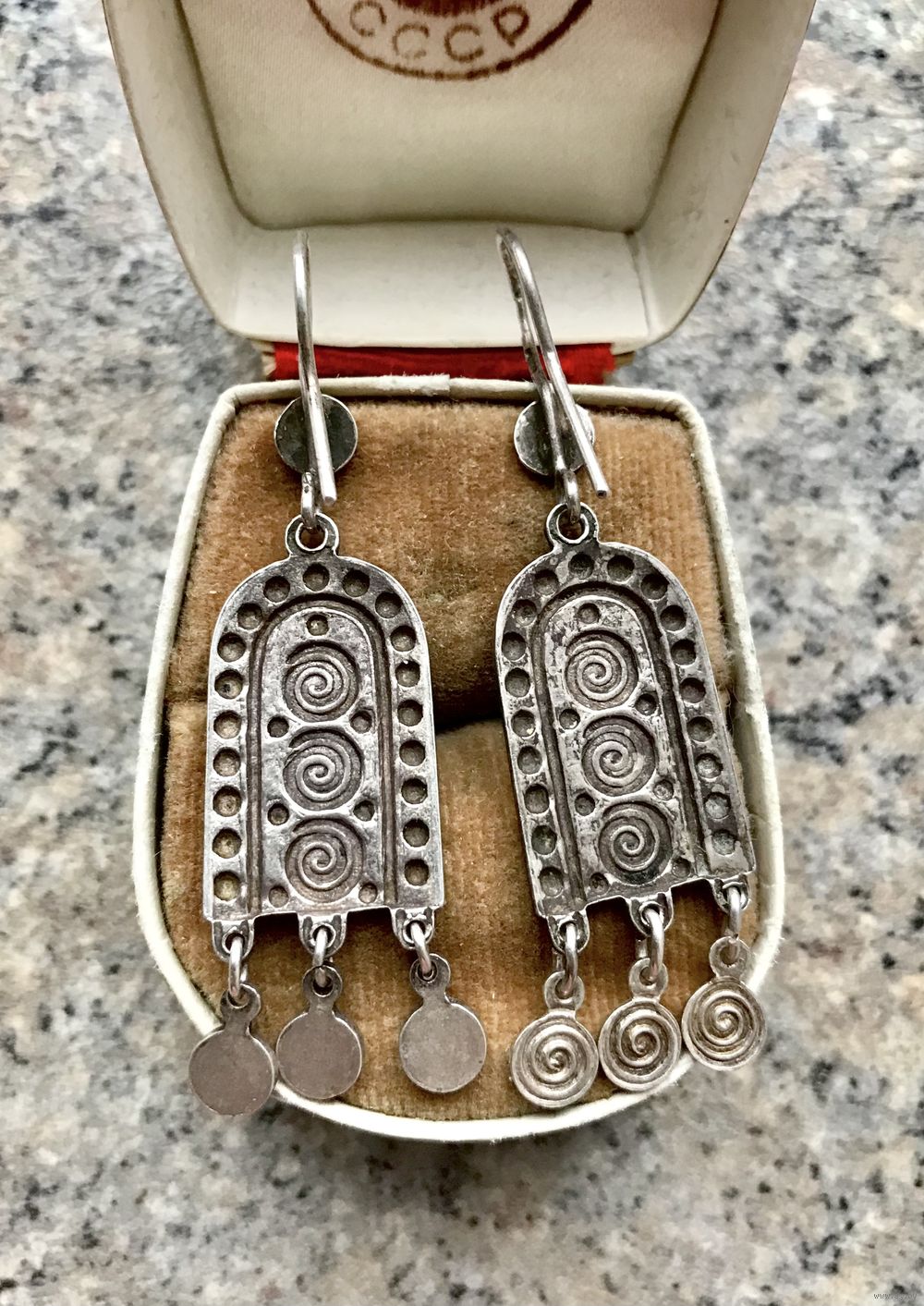 Крупные серьги из серебра 875пр. с контрастным оксидированием, сделаны в 1970г. на Львовской ювелирной фабрике (стоит именник 0ЛВ). Редко встречающаяся модель. Размер 5,4х1,4см., вес чуть больше 8гр. На одной серьге с обратной стороны на висюльках нет орнамента, но в носке это не заметно. Состояние хорошее.