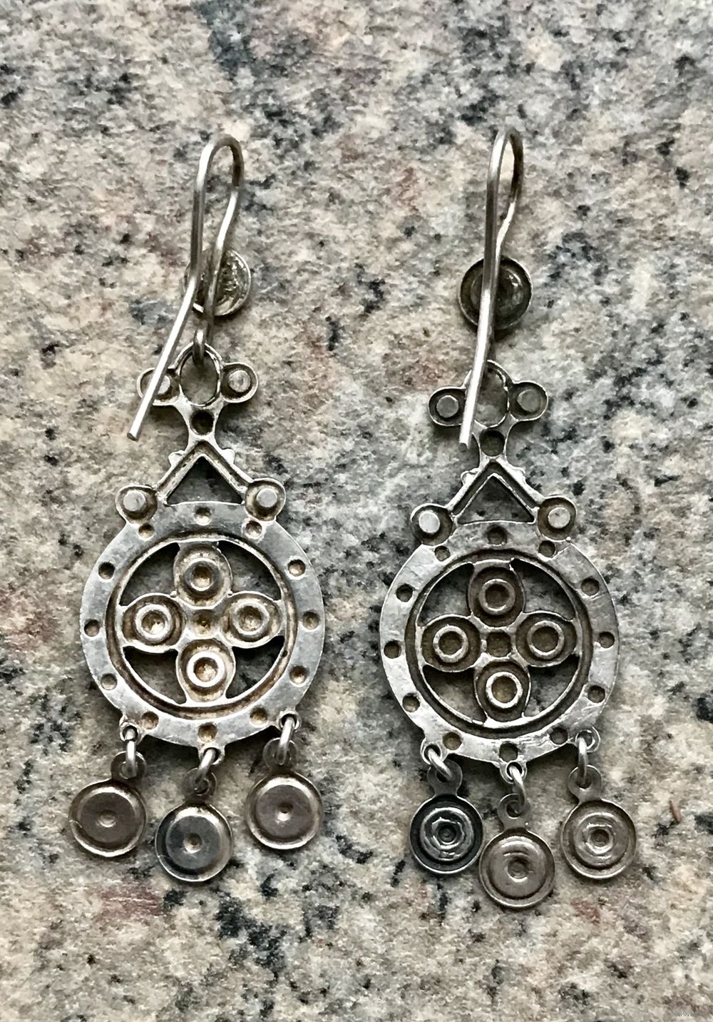 Крупные серьги из серебра 875пр. с контрастным оксидированием, сделаны на Львовской ювелирной фабрике. Разнопарки. Одна серьга сделана в 1970г.(стоит именник 0ЛВ), вторая в 1971г.(именник 1ЛВ). Есть несущественное отличие, на фото отметила красными кружками. Высота серьги 5,8см., вес пары чуть больше 8гр. Редко встречающаяся модель.