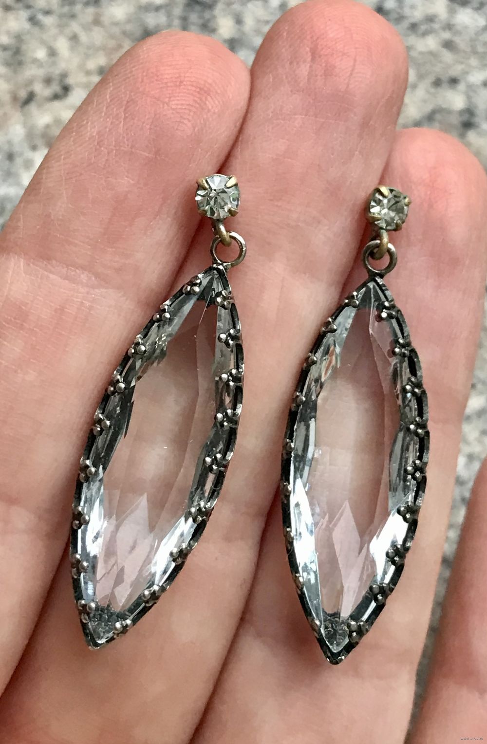 Винтажные (1980-е гг.) чешские серьги-пусеты с основой из бижутерного сплава и вставок из стекла и кристаллов. Высота серьги 4см. Имеются незначительные потёртости на металле, общее состояние хорошее.