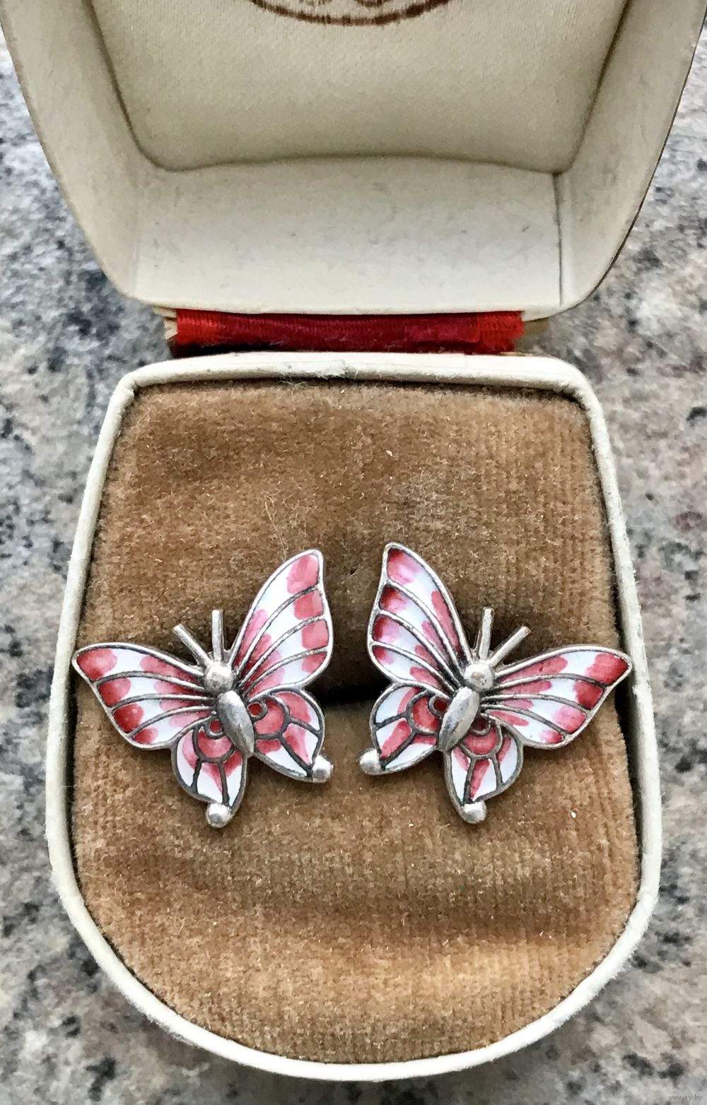 Винтажные серьги из мельхиора, лицевая сторона украшена эмалью. На обратной стороне одной серьги стоит клеймо ПО «Русские самоцветы». Размер бабочки 1,5х1,8см. Состояние хорошее.