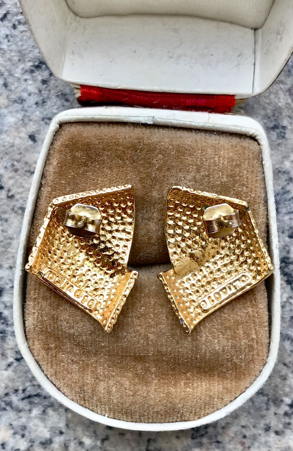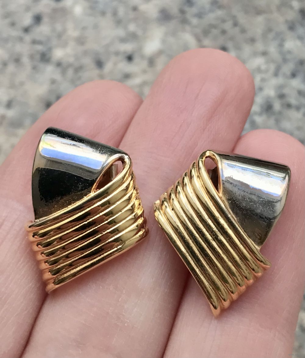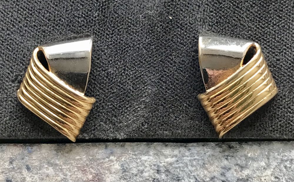 Крупные серьги-пусеты из металла двух тонов, имеются незначительные потёртости. Маркированы. Атрибутировать не удалось. Размер серьги 2,2х1,5см.