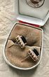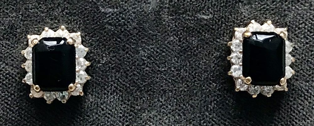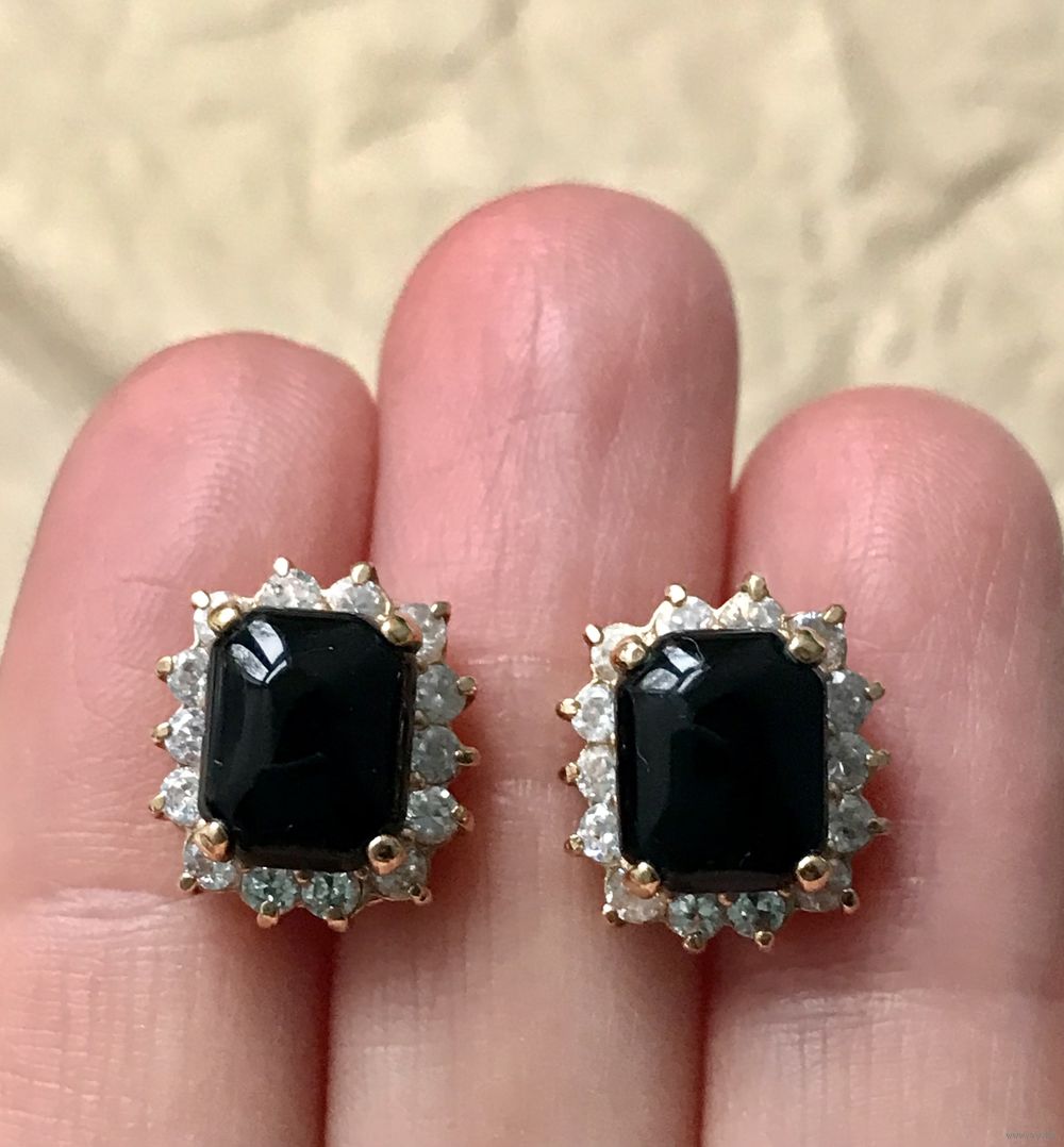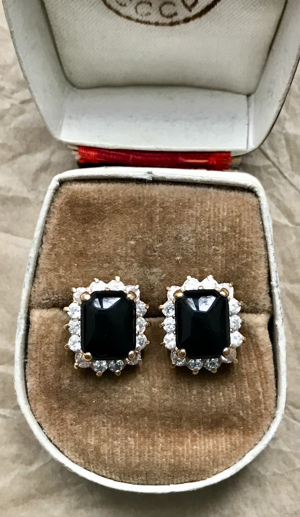 Серьги-пусеты из бижутерного сплава золотого тона, вставки из стекла чёрного цвета и кристаллов. Высота серьги 1,5см., размер центральной вставки 0,9х0,7см. Состояние хорошее.