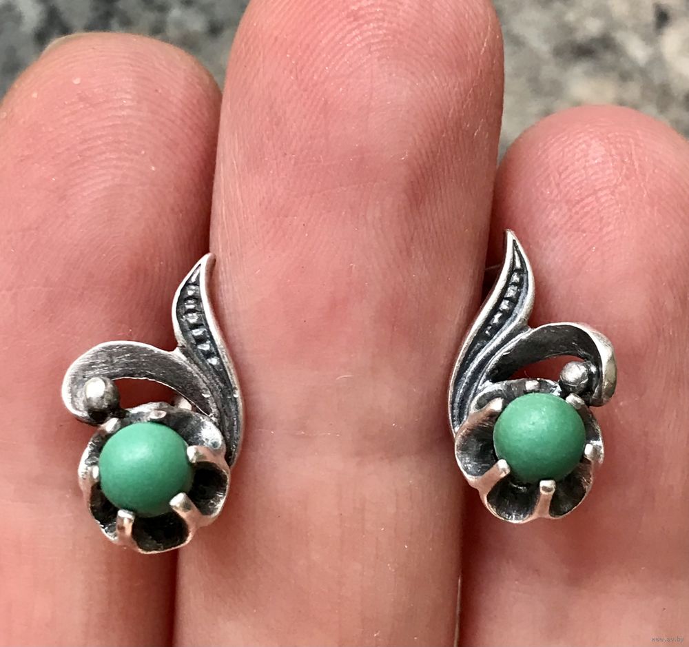 Серьги из серебра 875пр. со вставками из бирюзы. Сделаны в 1987г. в Москве (именник .7МЮ). Высота серьги 1,6см., вес пары 3,67гр. Состояние хорошее.