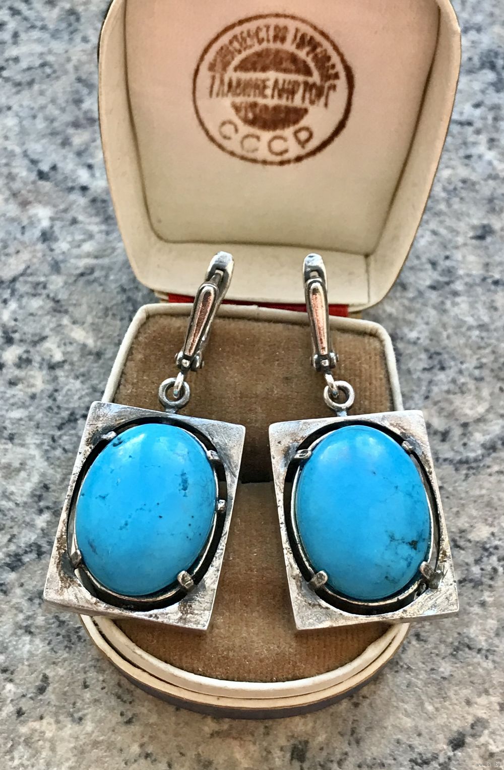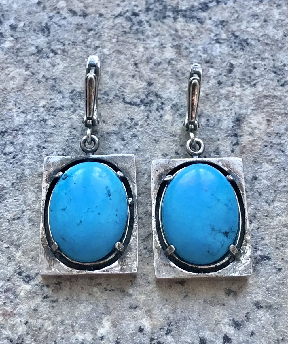 Крупные серьги с основой из металла с глубоким серебрением и вставок из синт.бирюзы (на одной вставке с обратной стороны есть отверстия, похожие на каверны). Высота серьги 4,5см., размер подвески 3х2см., размер вставки 2х1,5см.