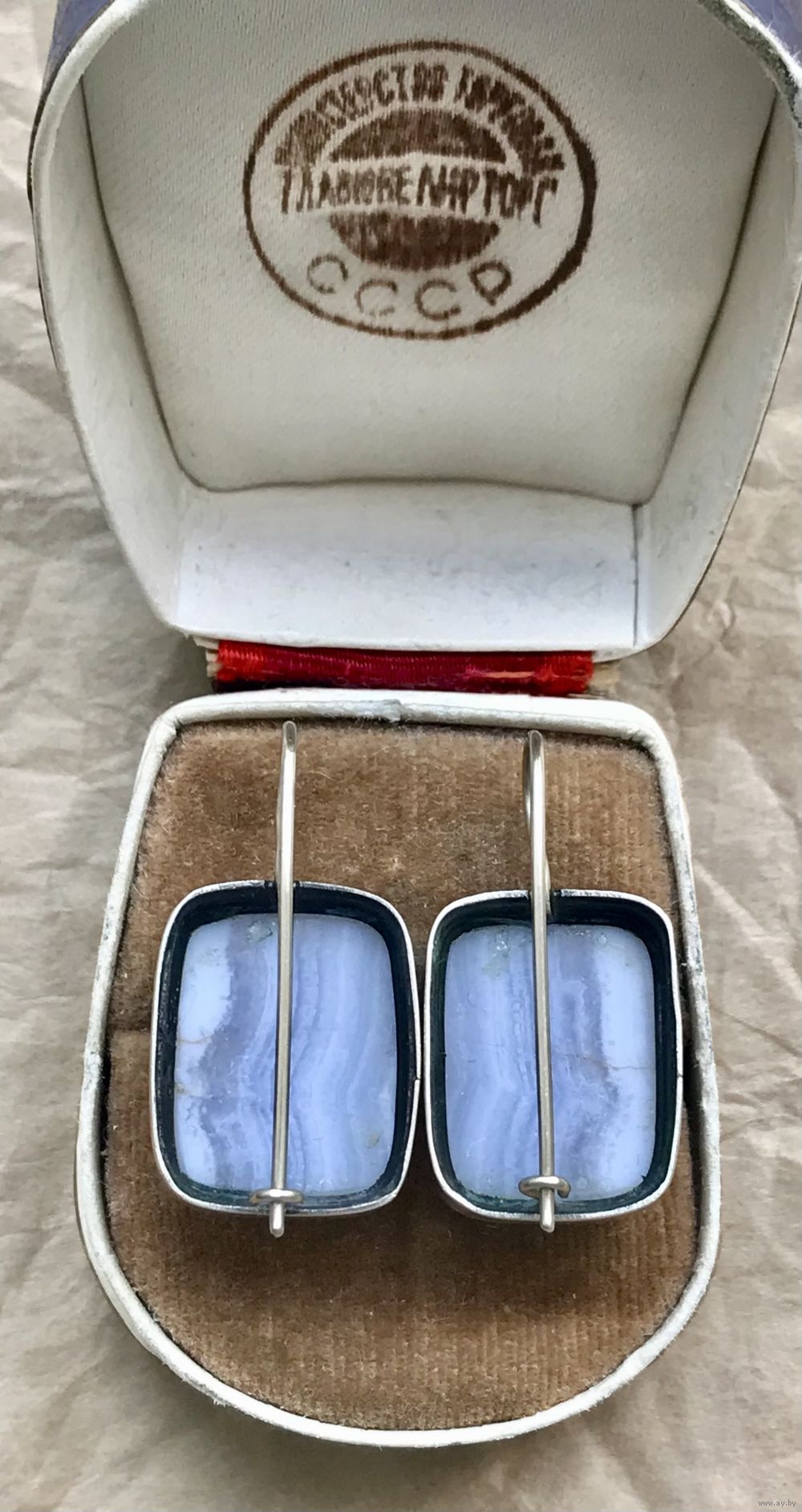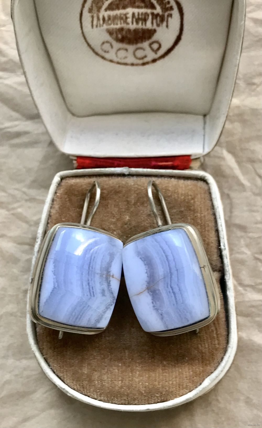 Крупные серьги с основой из мельхиора и вставками из голубого агата. Высота серьги с петлей 3см., размер вставки 1,6х1,3см., состояние хорошее.