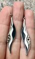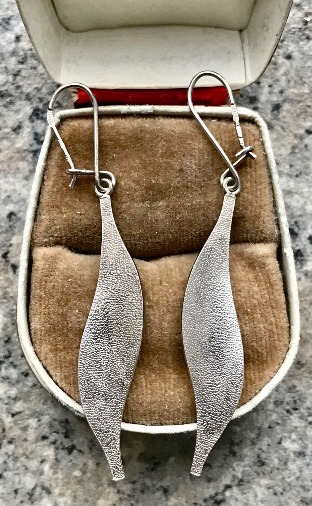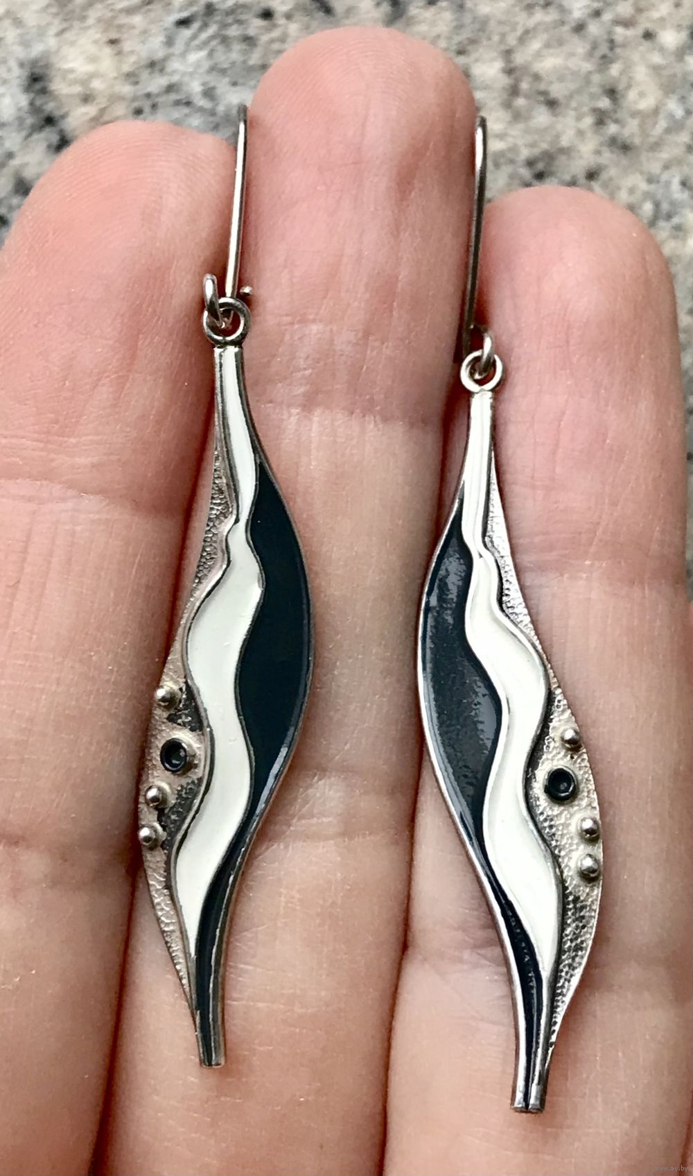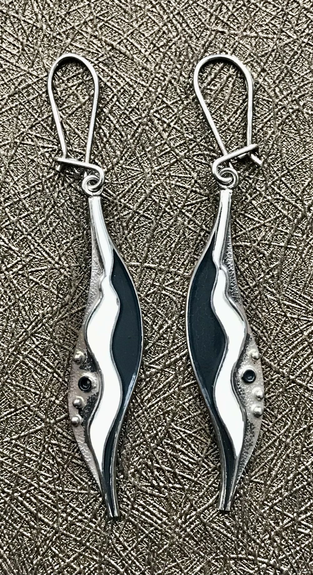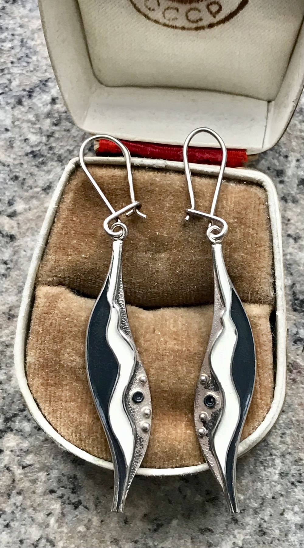 Серьги из серебра 875пр., лицевая сторона украшена эмалью. Сделаны в 1989г. на Рижском юв. заводе. Высота серьги 5,8см. Состояние хорошее.