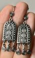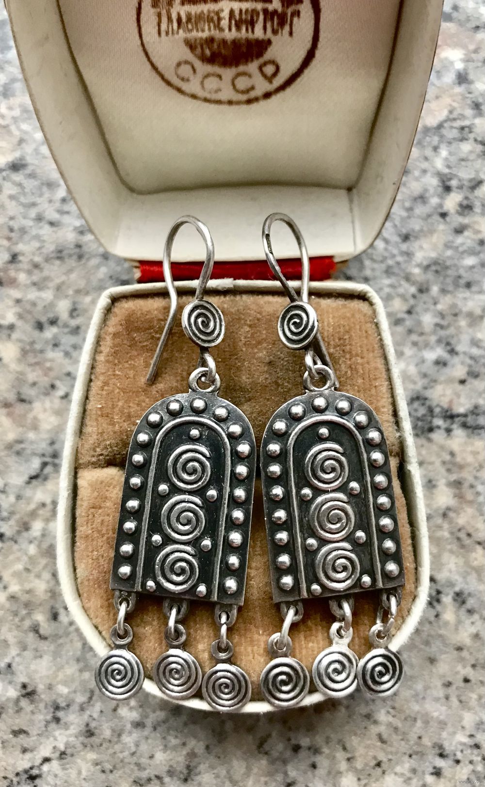 Крупные серьги из серебра 875пр. с контрастным оксидированием, сделаны в 1970г. на Львовской ювелирной фабрике (стоит именник 0ЛВ). Редко встречающаяся модель. Размер 5,4х1,4см., вес чуть больше 8гр. На одной серьге с обратной стороны на висюльках нет орнамента, но в носке это не заметно. Состояние хорошее.