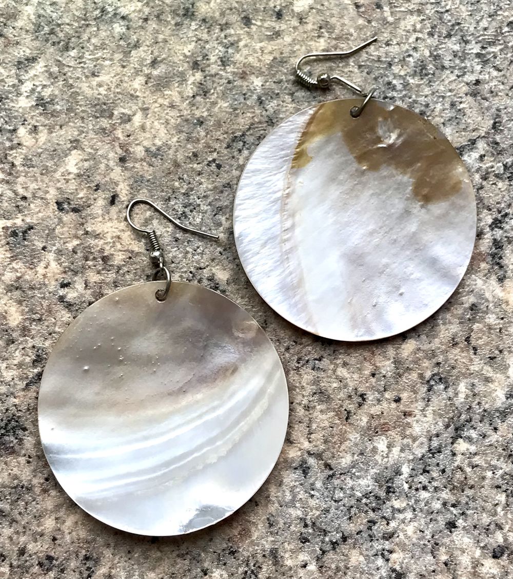 Крупные серьги с подвесками из натурального перламутра с рисунком на лицевой стороне. Высота серьги 6,5см., диаметр подвески 5см. Состояние хорошее.