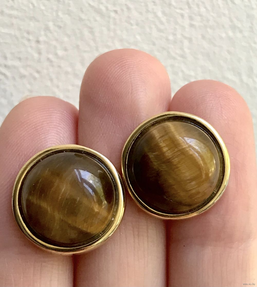 Крупные серьги пусеты от известного итальянско-бразильского дизайнера Francesca Romana Diana. Все украшения этого дизайнера изготавливаются вручную. Основа данных пусет изготовлена из гипоаллергенного сплава золотого тона, вставки из камня тигровый глаз. Диаметр серьги 1,7см., диаметр вставки 1,4см. Маркированы. Состояние хорошее.