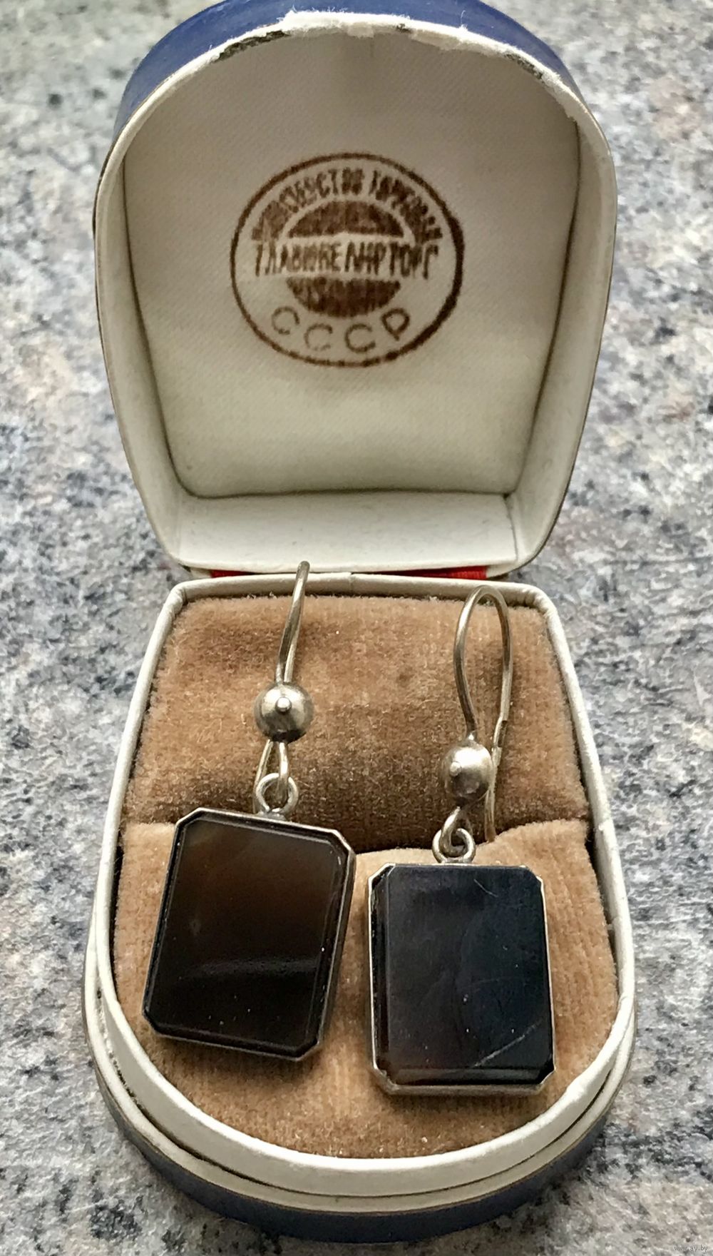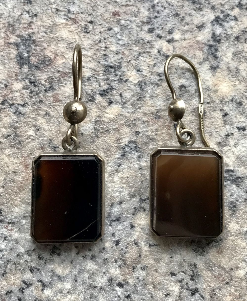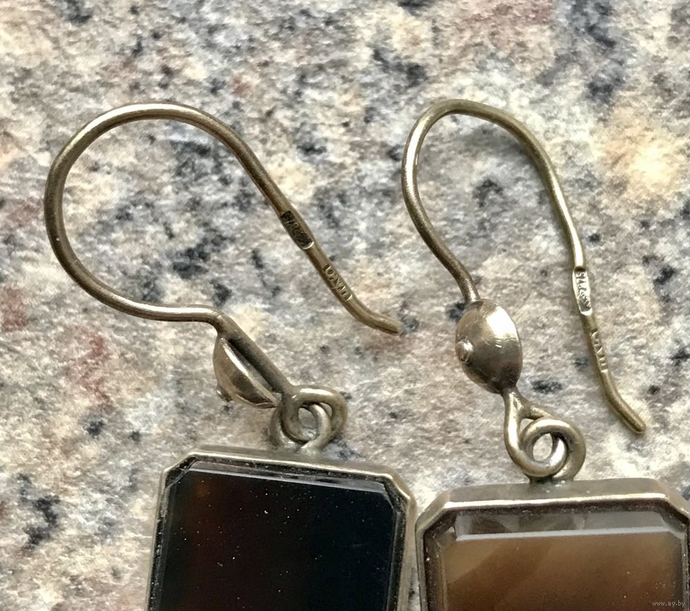 Серьги из серебра 875пр. с лёгкой позолотой и вставками из нат.агата. Изготовлены в 1974г. в Ленинграде (именник 4ЛЮ). Высота серьги 4см., размер вставки 1,5х1,2см. На одной вставке имеются трещины с лицевой и обратной сторон (не сквозные, возможно можно отшлифовать у мастера). Этот нюанс очень сильно учтен в цене.