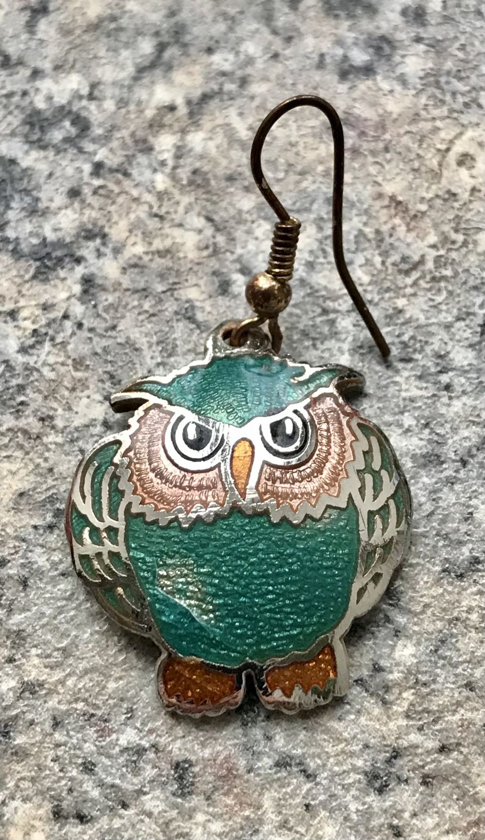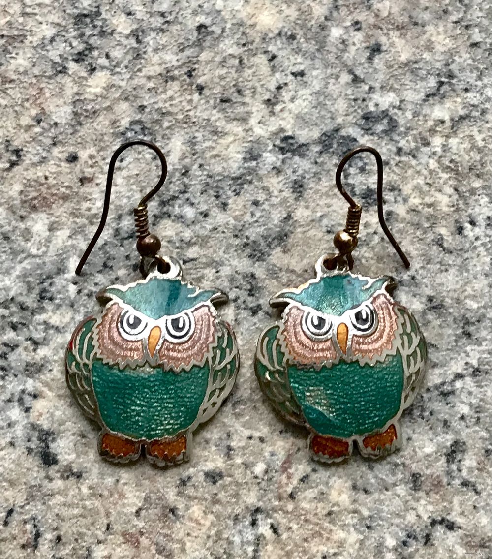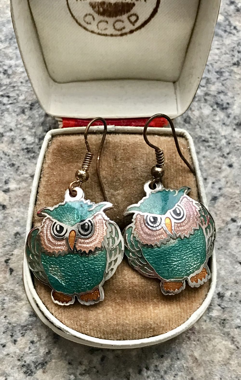 Винтажные серьги известного английского бренда Fish&Crown. Лицевая сторона украшена эмалью. На одной серьге есть поверхностный скол эмали (в глаза не бросается, учтено в цене). Высота серьги 4см., подвеска-сова 2,4х2см.Не маркированы.
