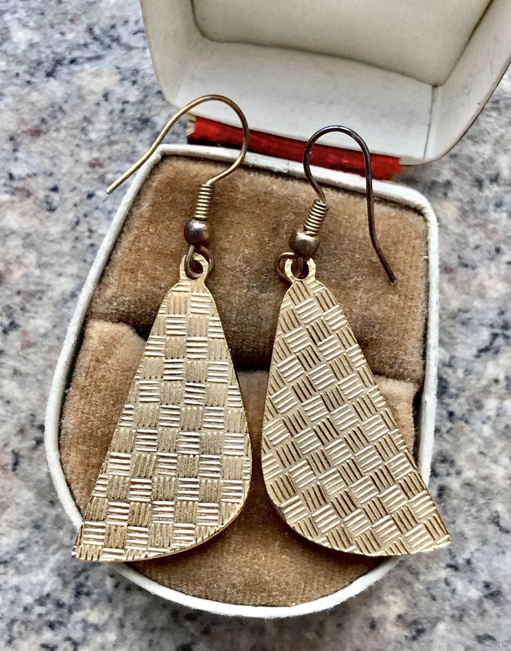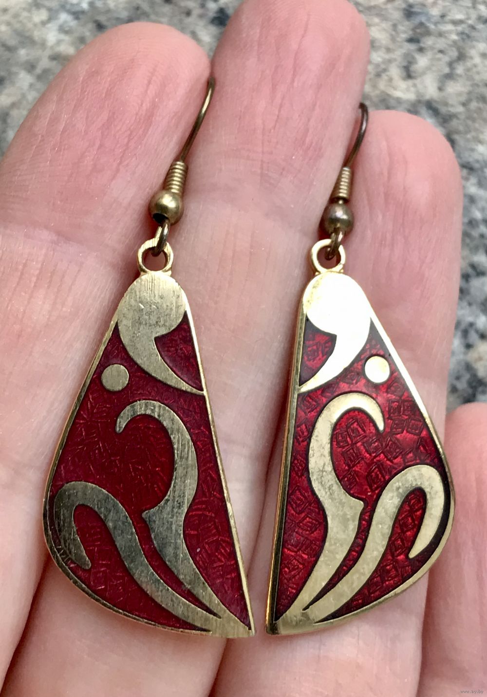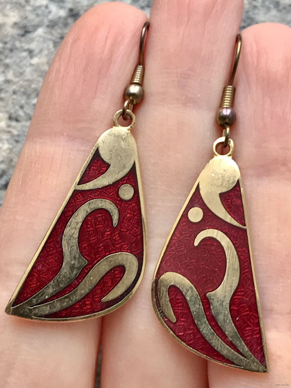 Винтажные серьги с основой из металла с позолотой, лицевая сторона украшена эмалью. Высота серьги 5см. Состояние хорошее.