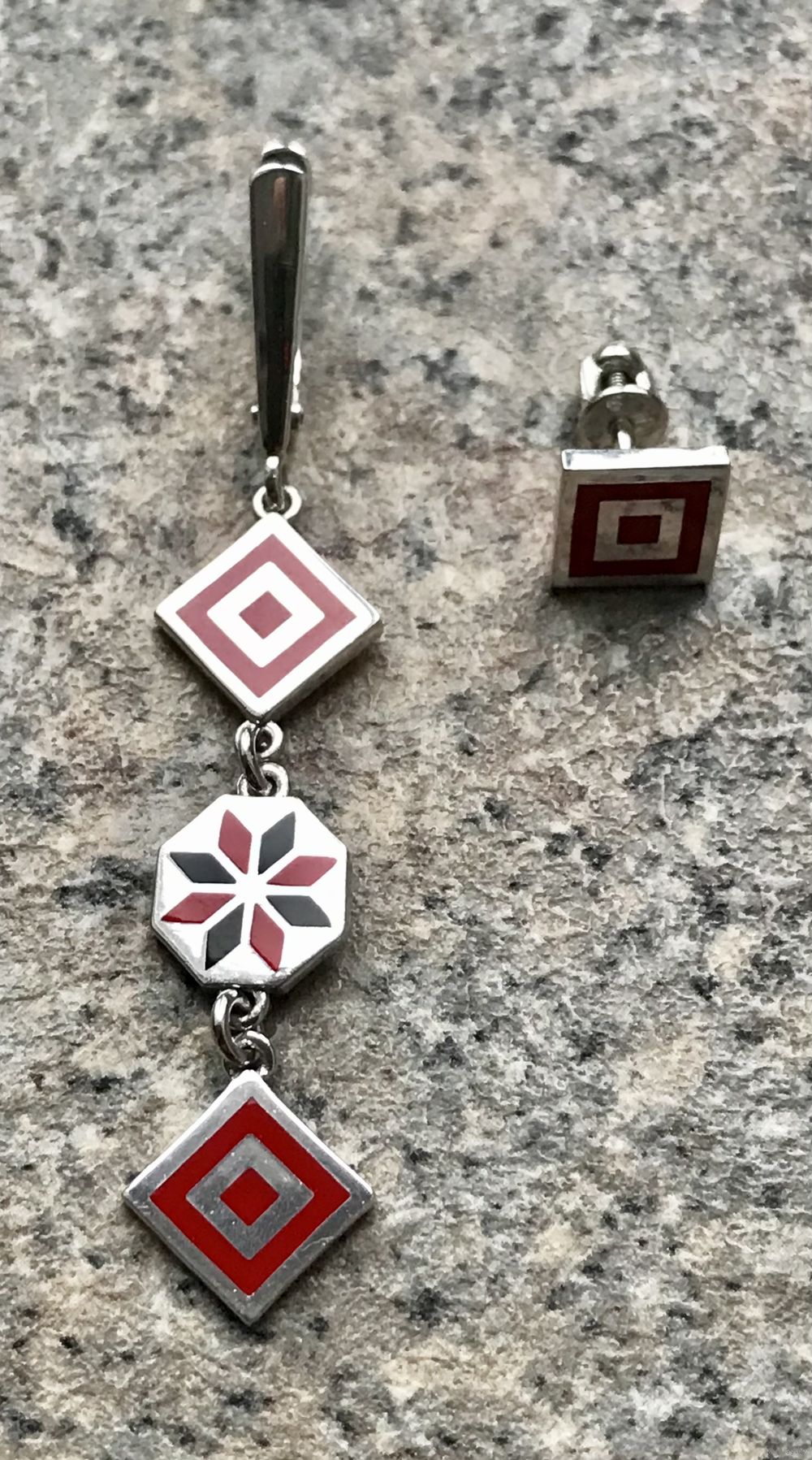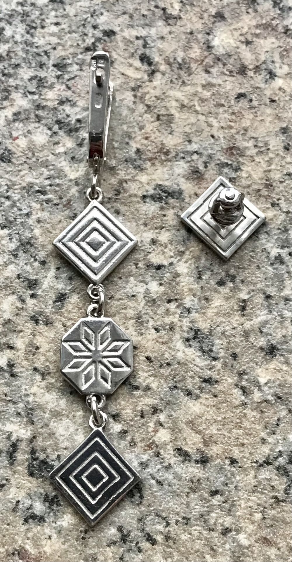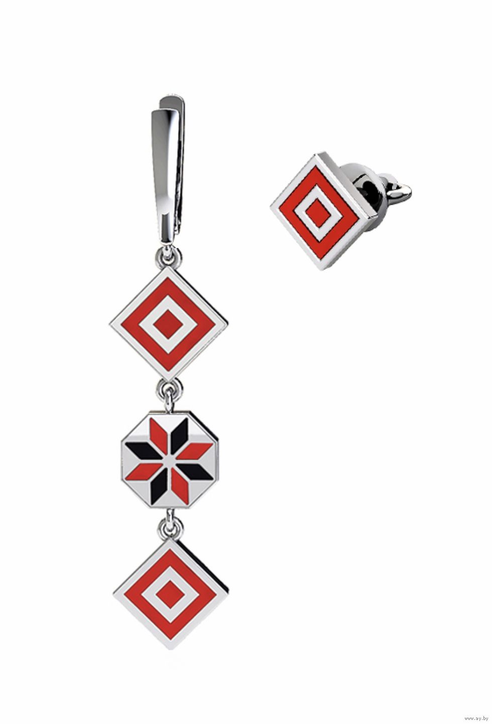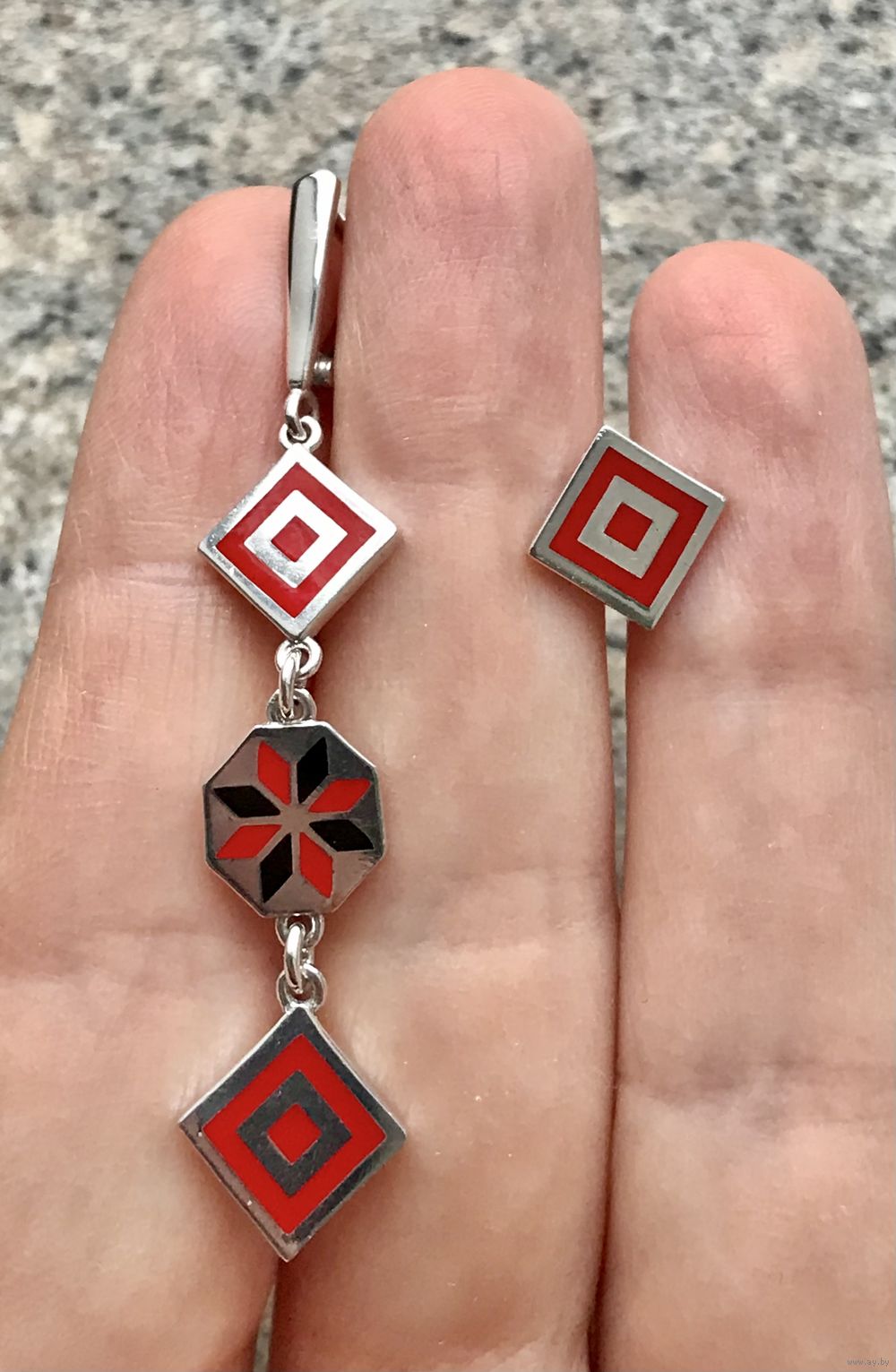 Серьги из серебра 925пр., лицевая сторона украшена эмалью. Коллекция Belarus от известного белорусского юв.производителя Ego-art . Высота серьги-висюльки 6см., размер пусеты 0,8х0,8см. Состояние хорошее.