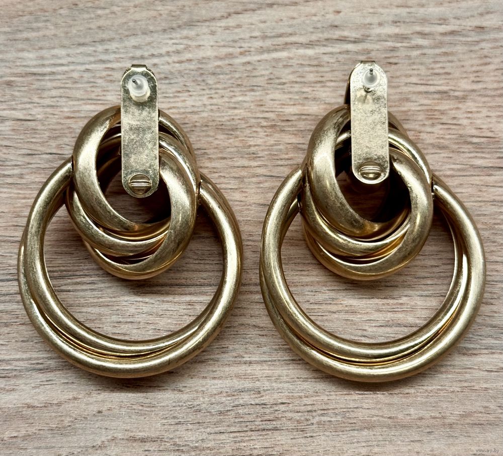 Крупные серьги-пусеты из металла золотого тона. Высота серьги 7см., ширина 5см. Состояние хорошее.