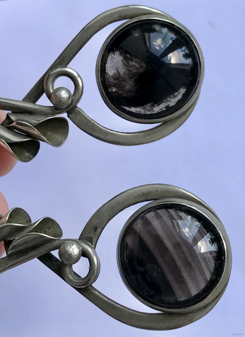 Винтажные крупные серьги с основой из мельхиора и вставок из агата. Рисунок в камнях отличается. Высота серьги 6,5см., диаметр вставки 1,5см. Ручная работа. Состояние хорошее.