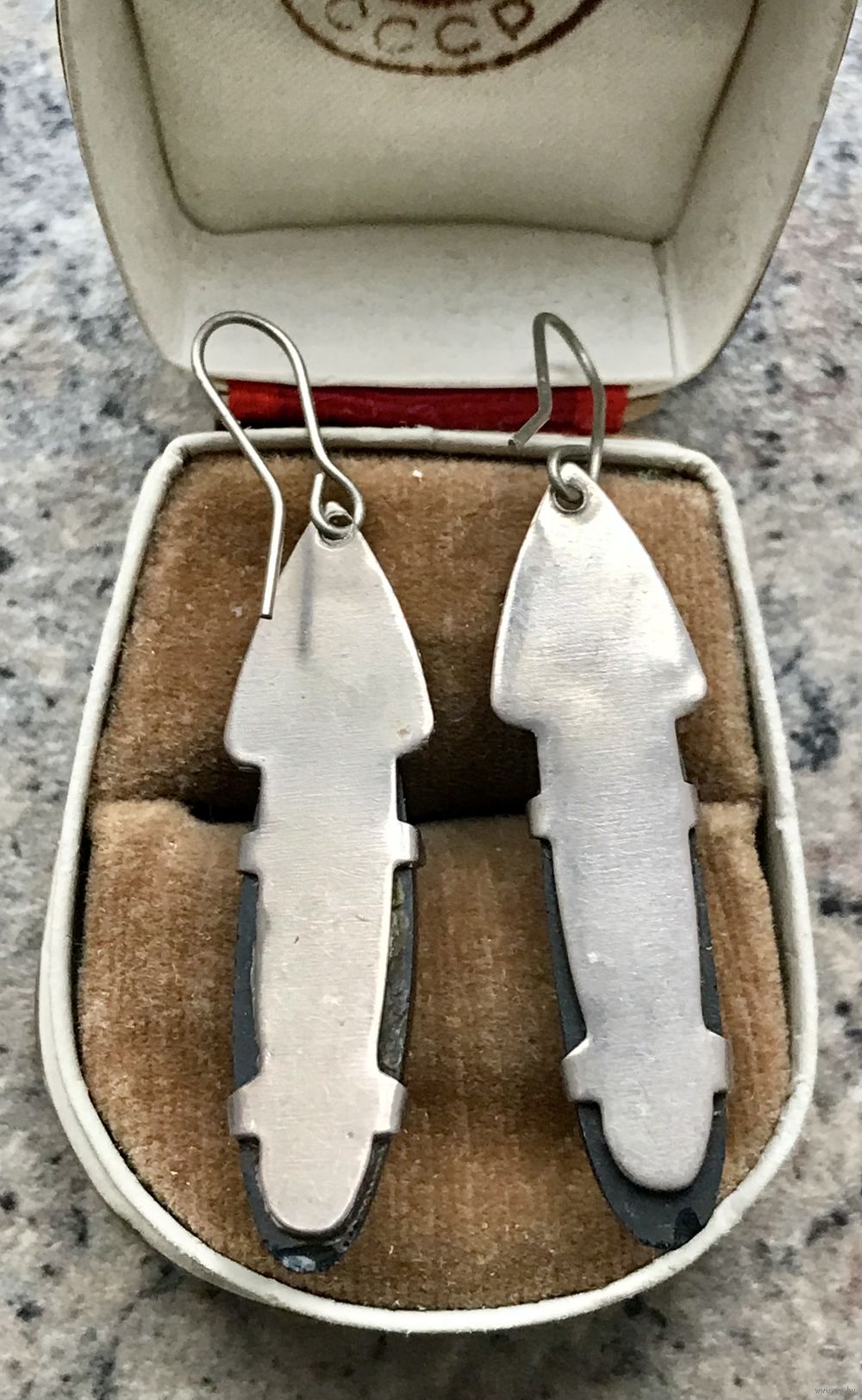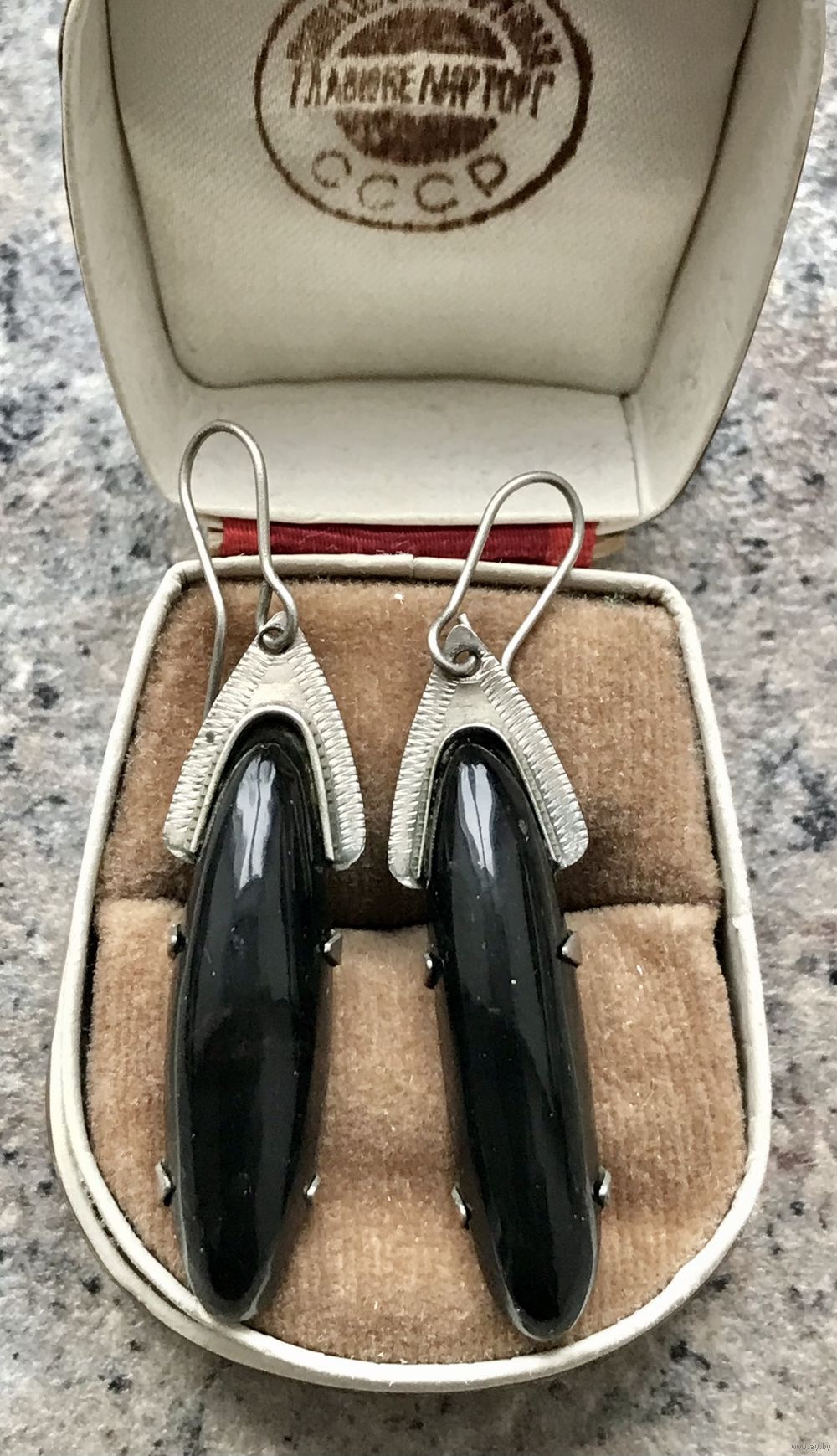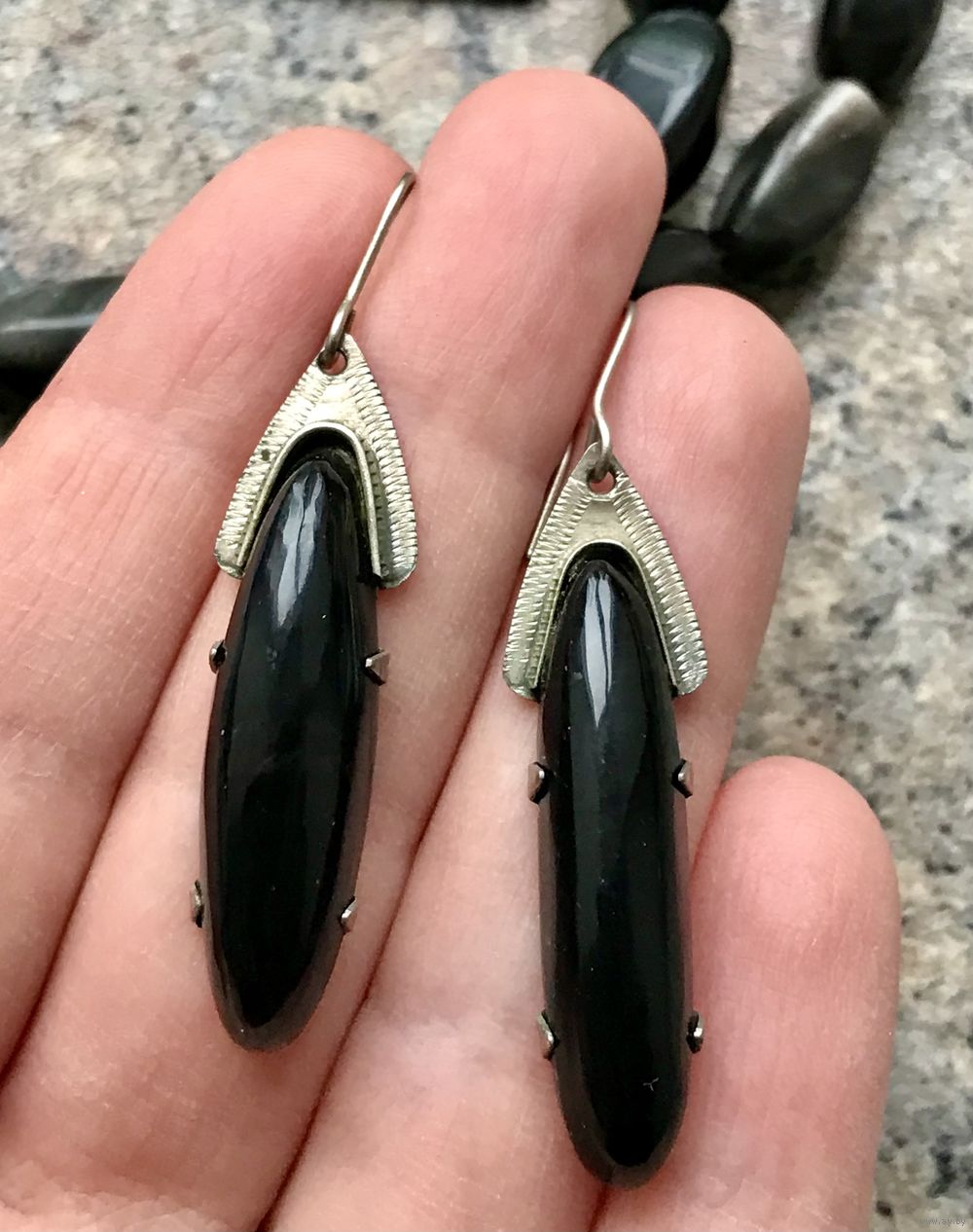 Винтажные серьги в стиле ар-деко. Основа из мельхиора, вставки из нат.камня (на обратной стороне внизу каждой серьги незначительные скольчики). Высота серьги 5,3см.