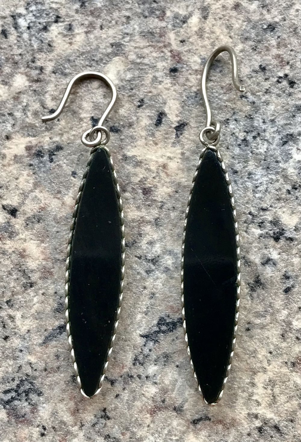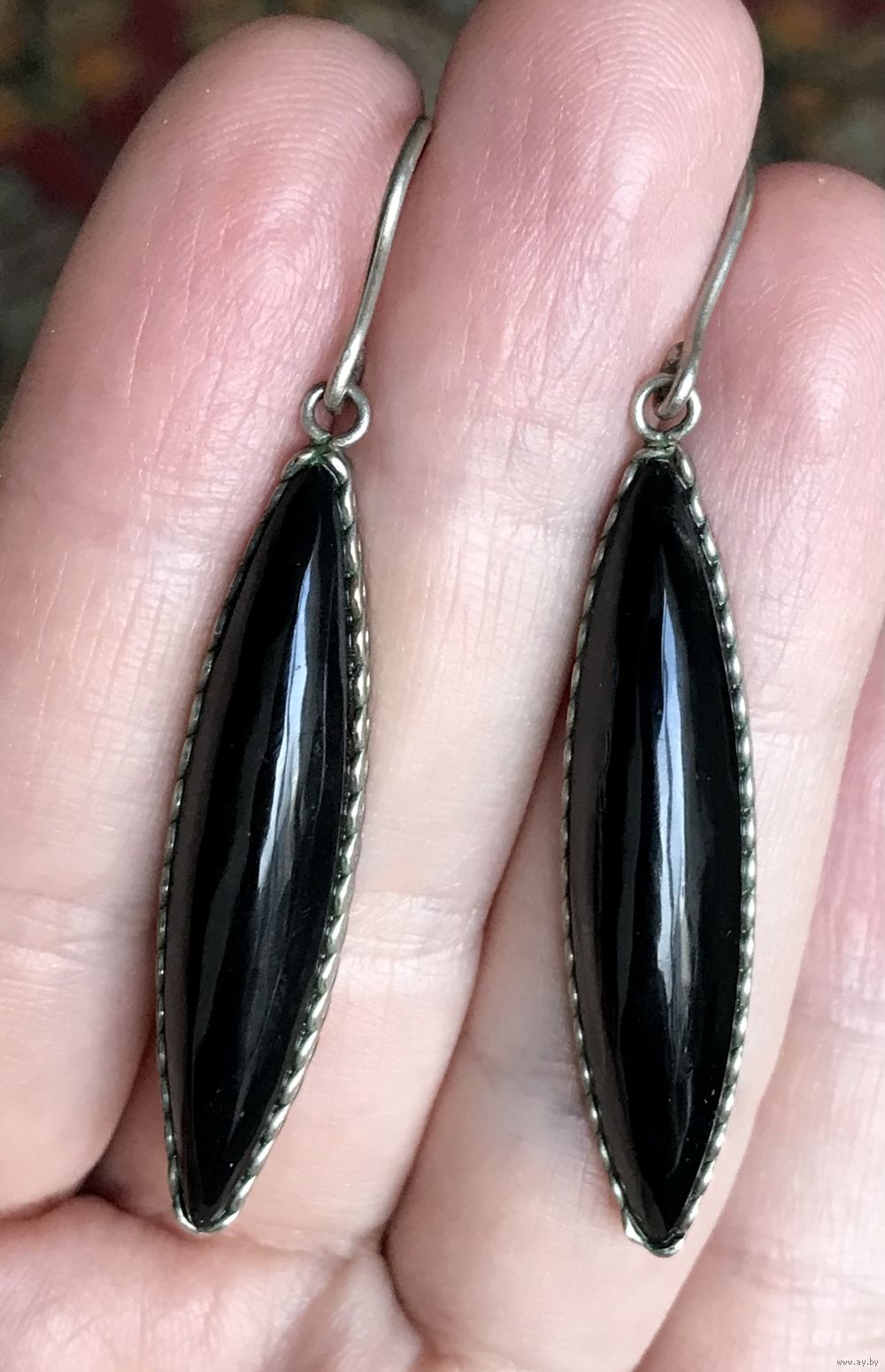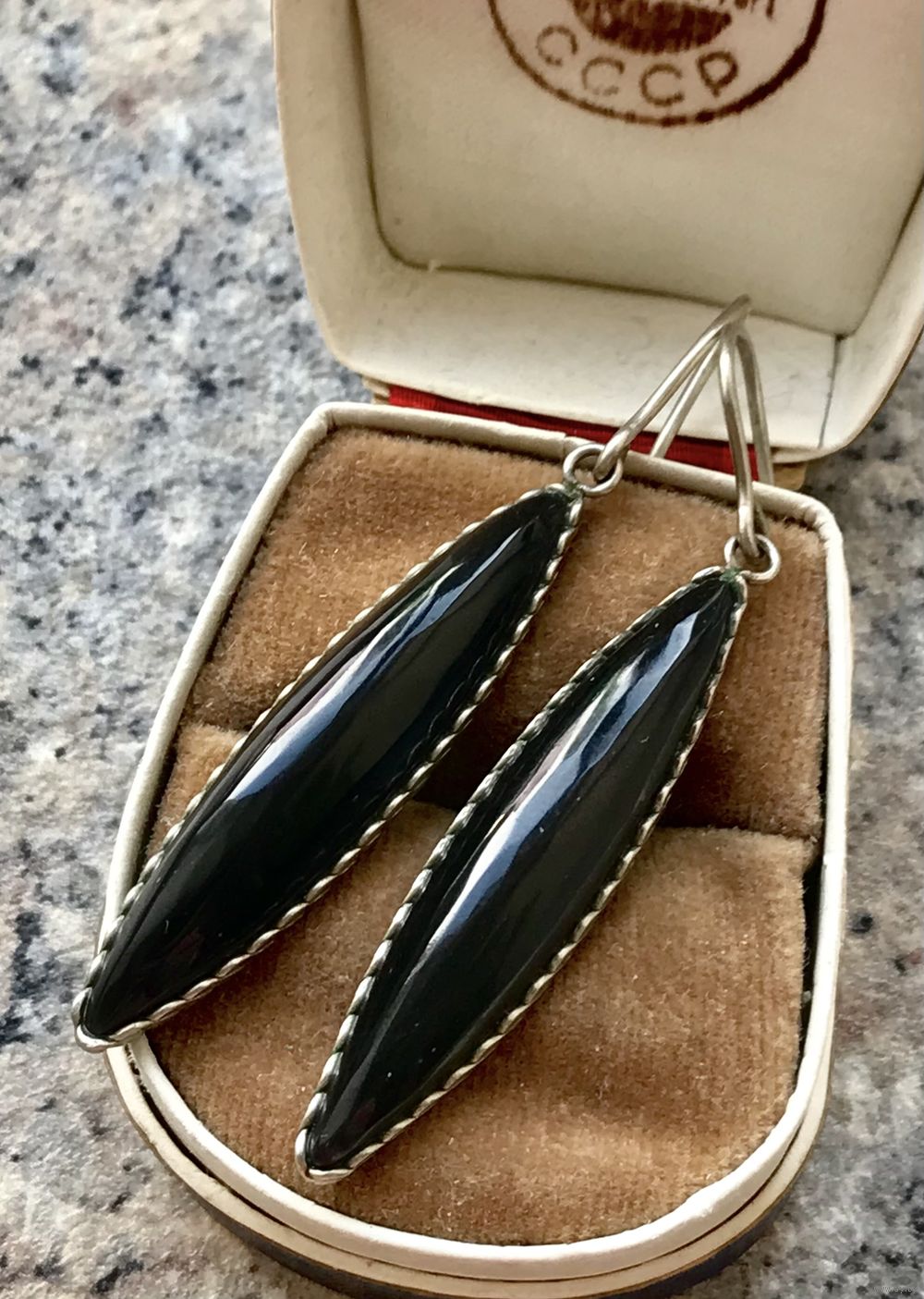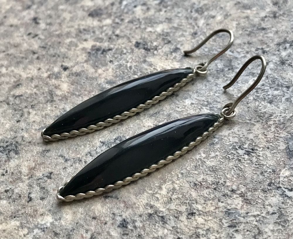Винтажные серьги с основой из мельхиора, вставки из нат.камня или цветного стекла насыщенного чёрного цвета. Высота серьги 5,5см., размер вставки 4х0,8см. Состояние хорошее.