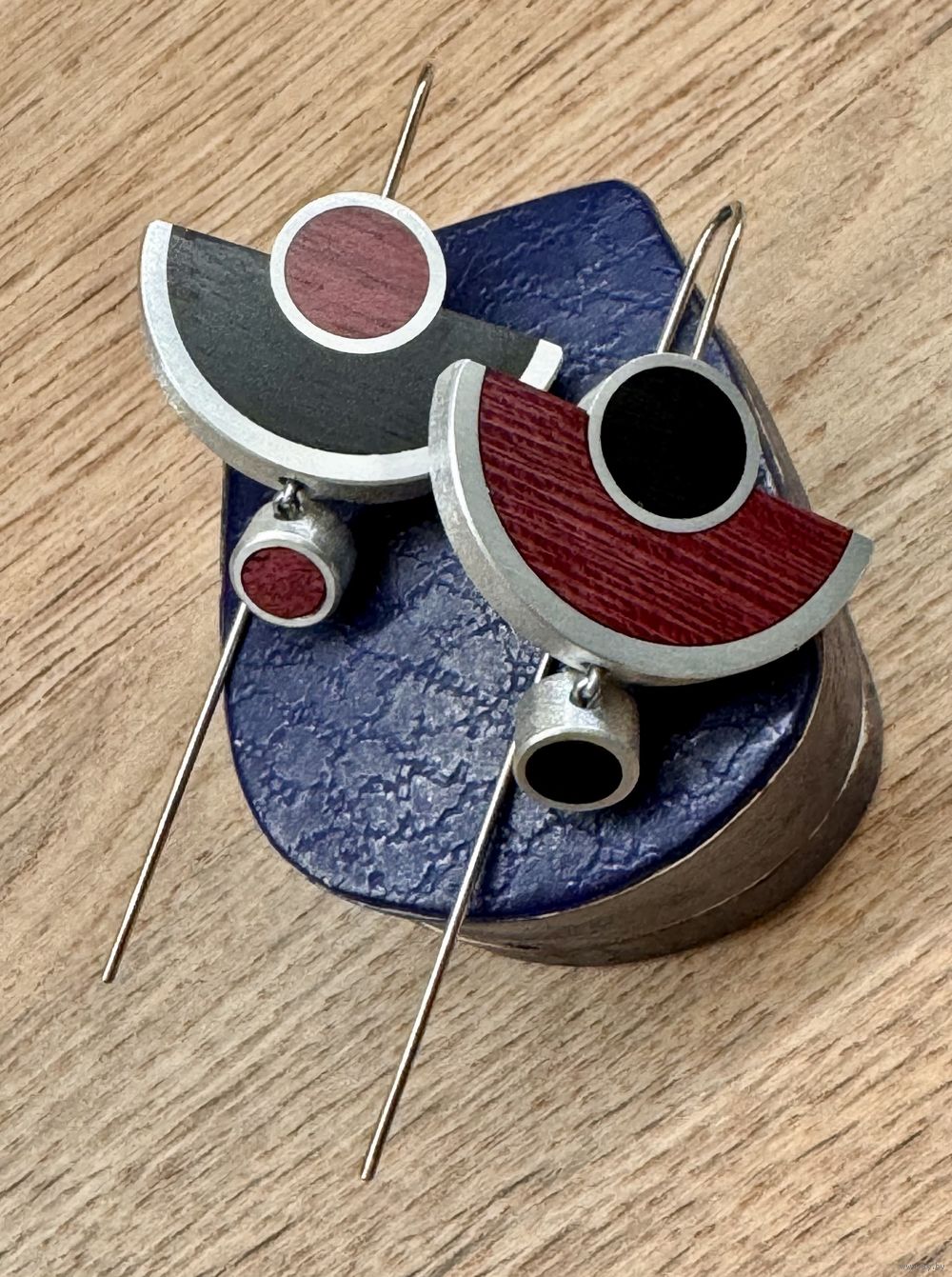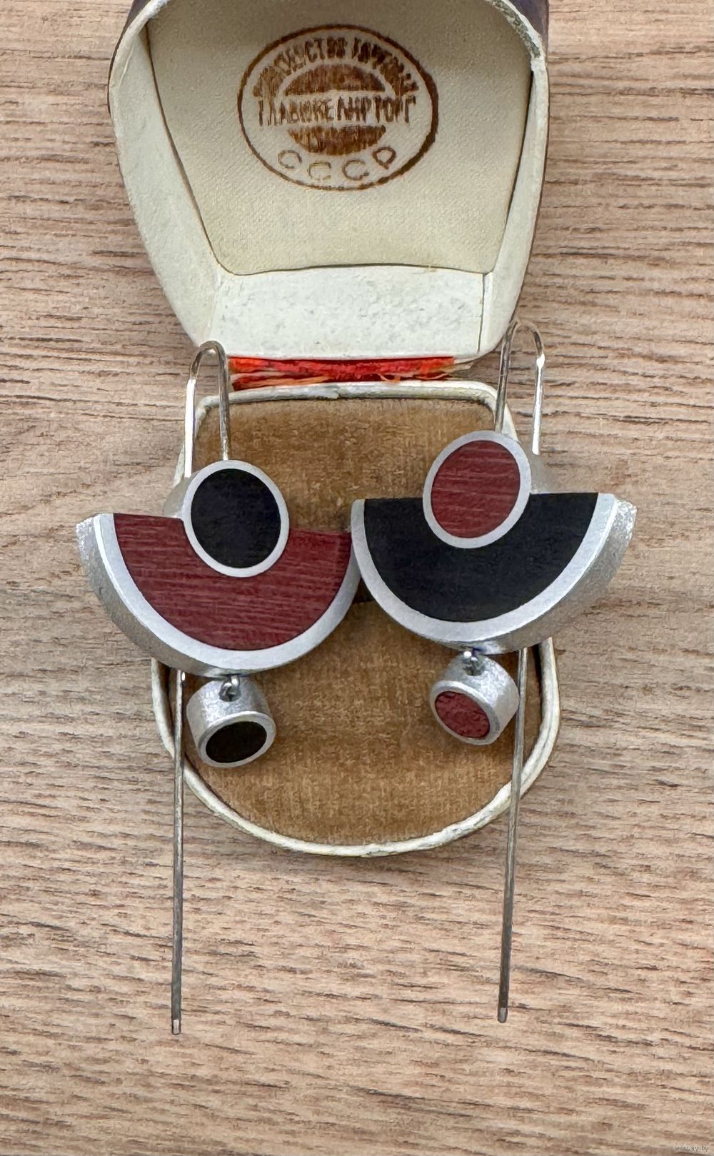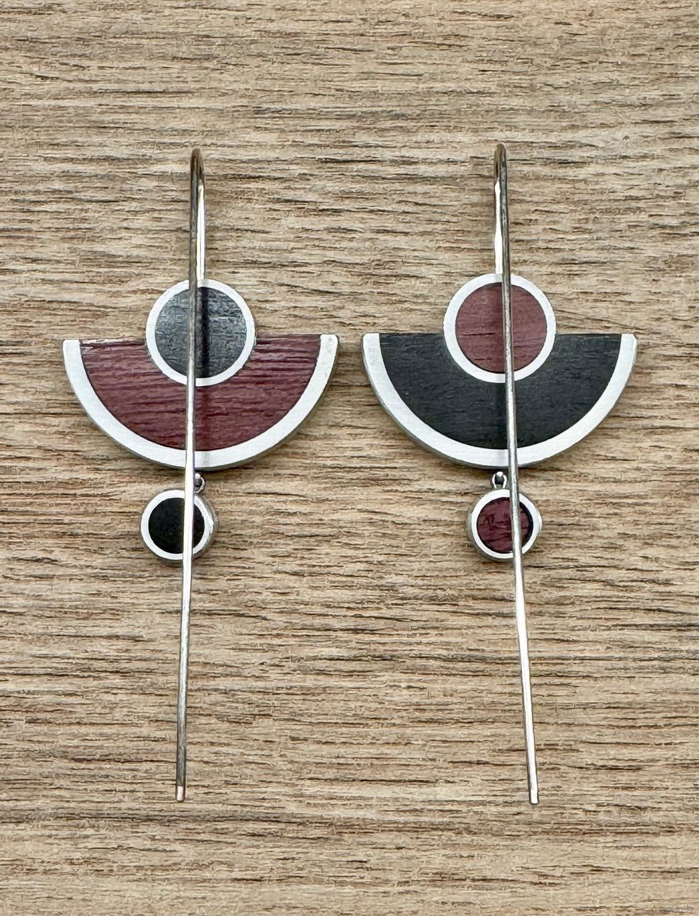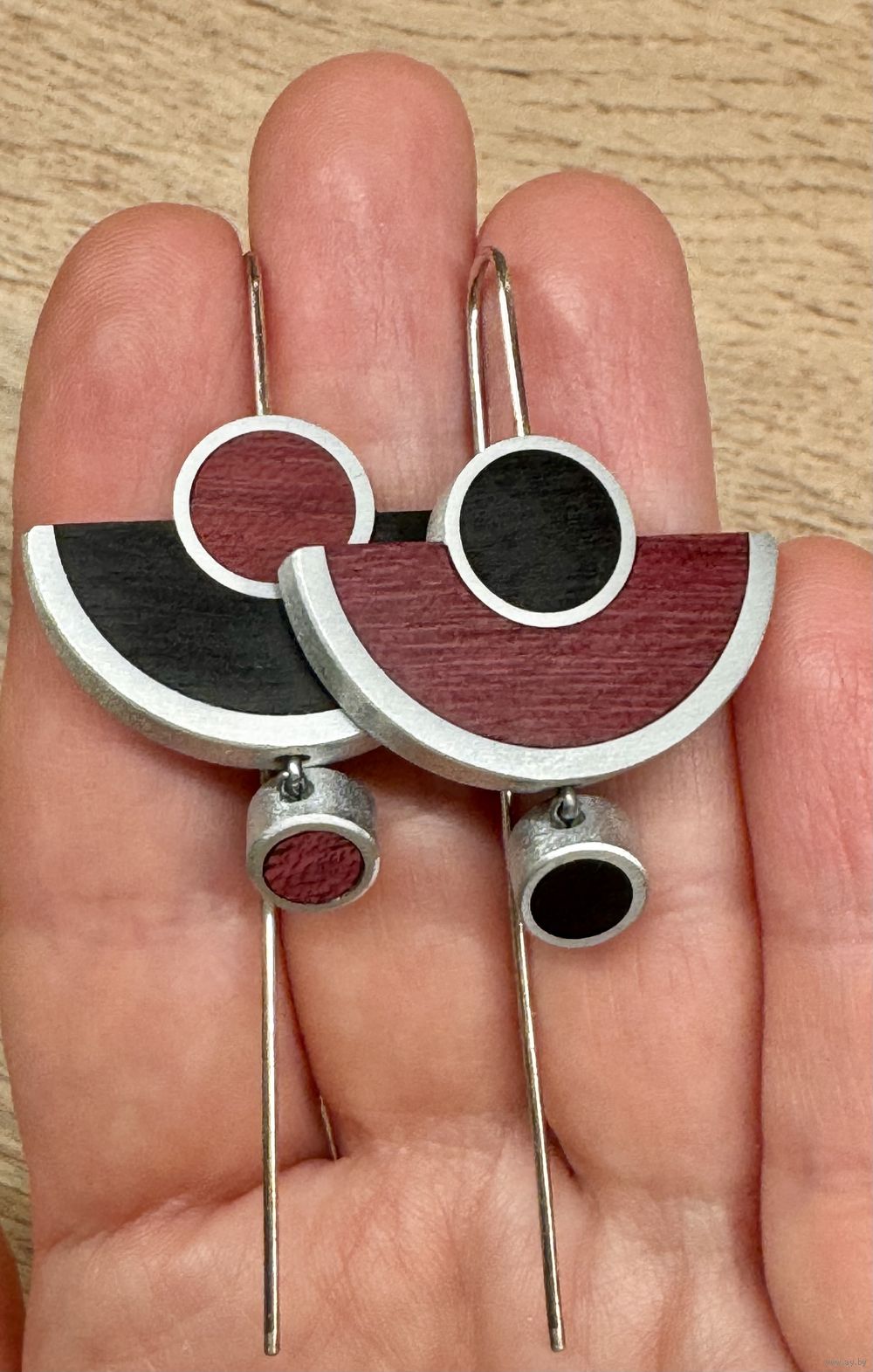 Серьги ISIDA российского бренда PANWOODS. Сделаны из серебра (швензы), алюминия (обрамление), вставки из дерева амарант и чёрный граб. Высота 7см., диаметр подвесок 4,5см. Состояние хорошее.