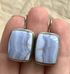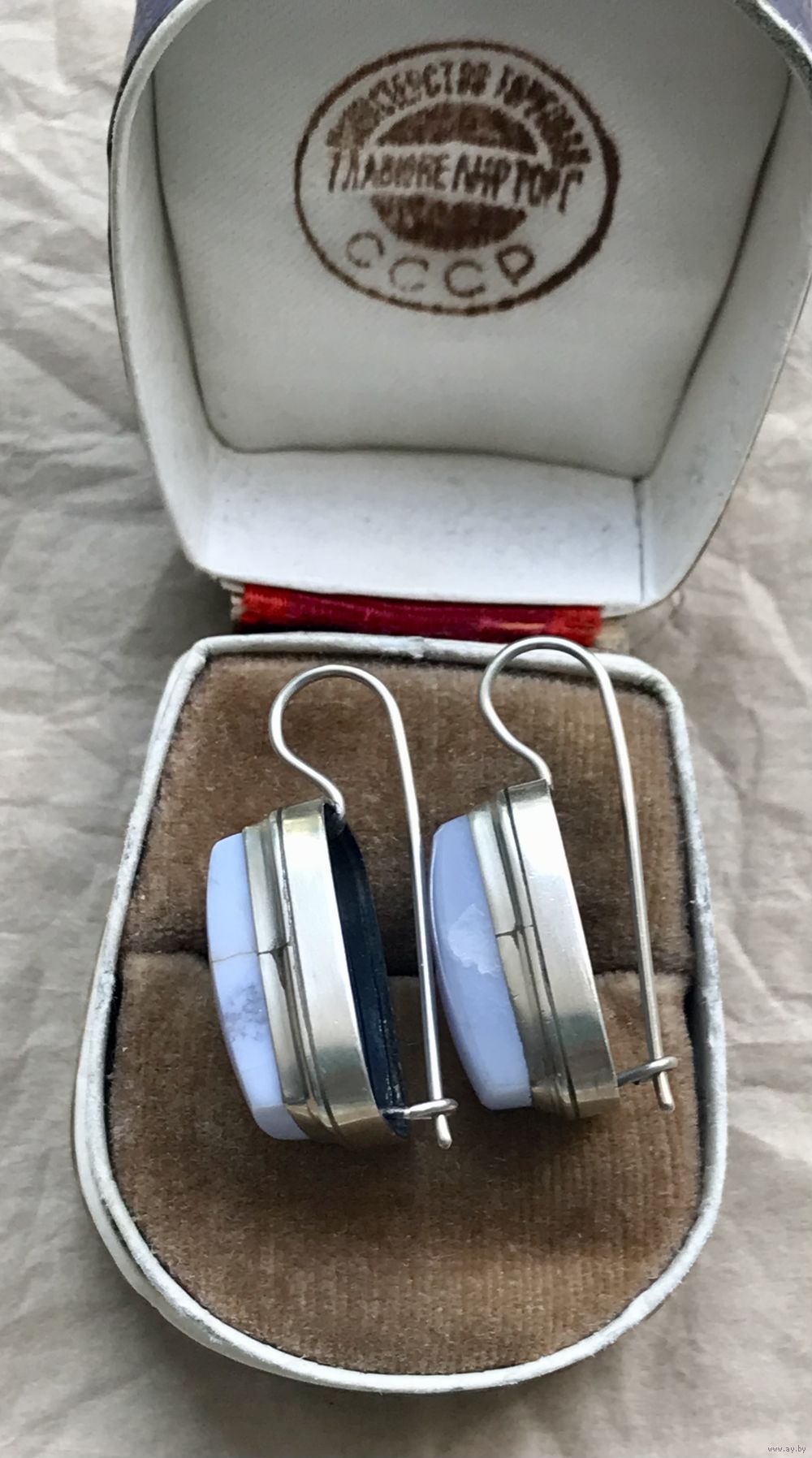 Крупные серьги с основой из мельхиора и вставками из голубого агата. Высота серьги с петлей 3см., размер вставки 1,6х1,3см., состояние хорошее.