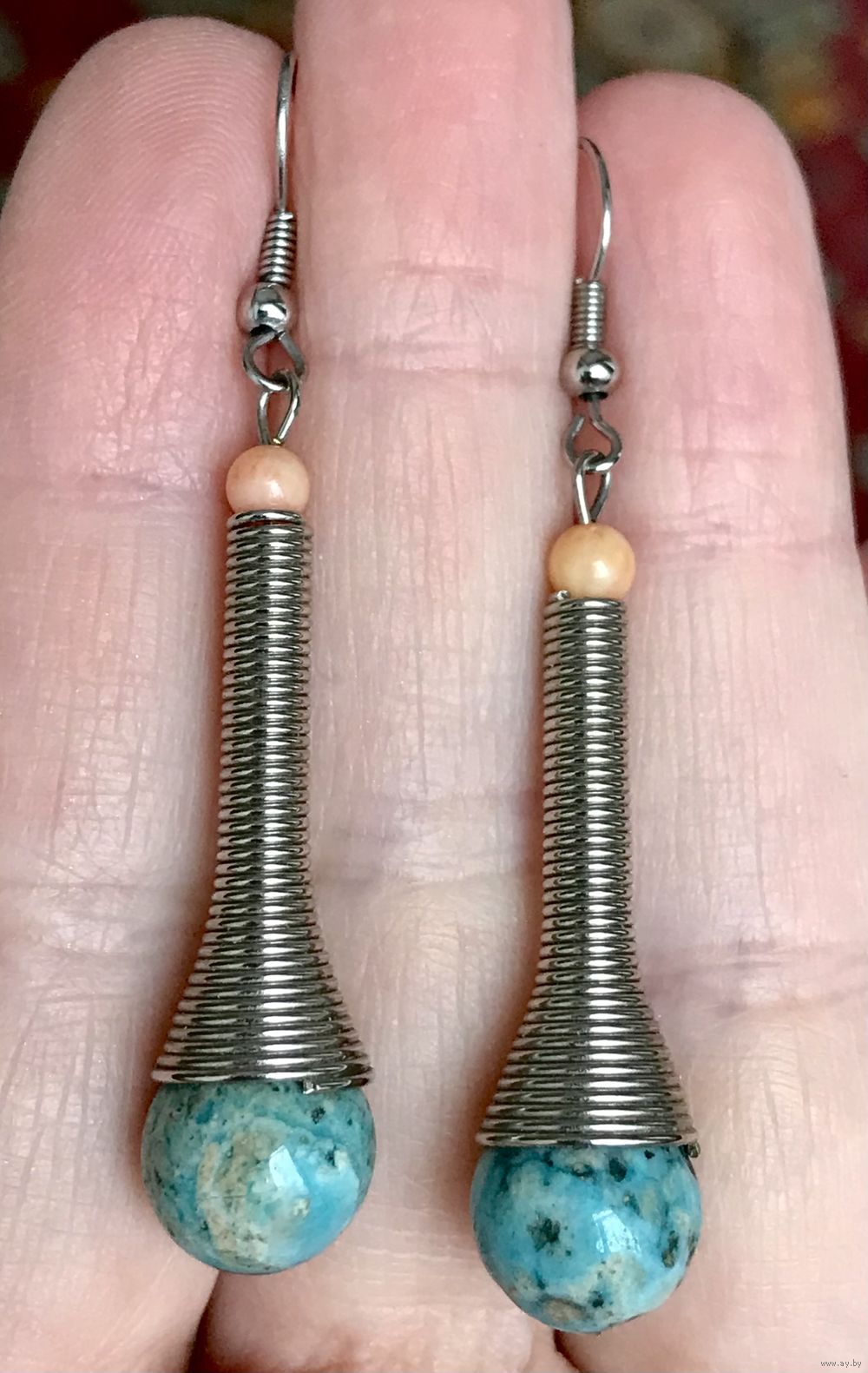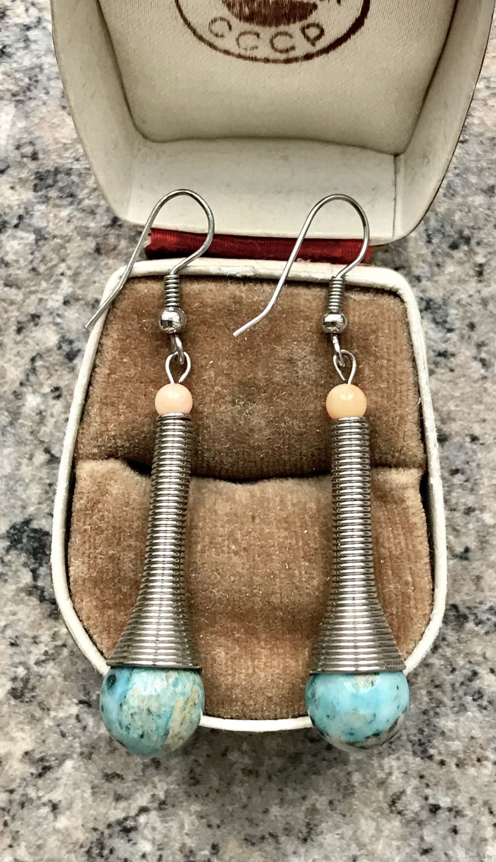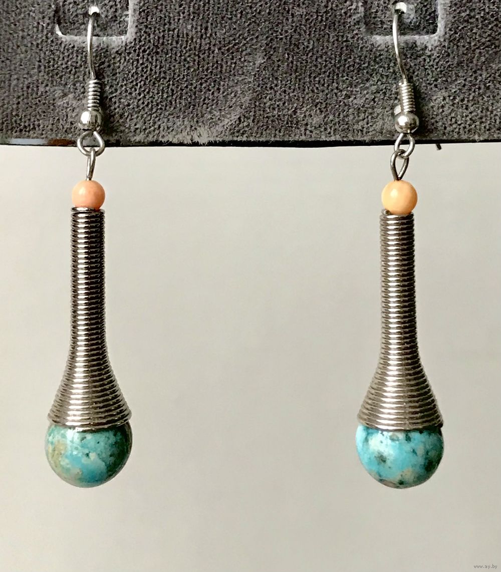 Серьги с основой из бижутерного сплава, вставки из художественного стекла. Высота серьги с петлей 5,5см. Состояние хорошее.