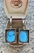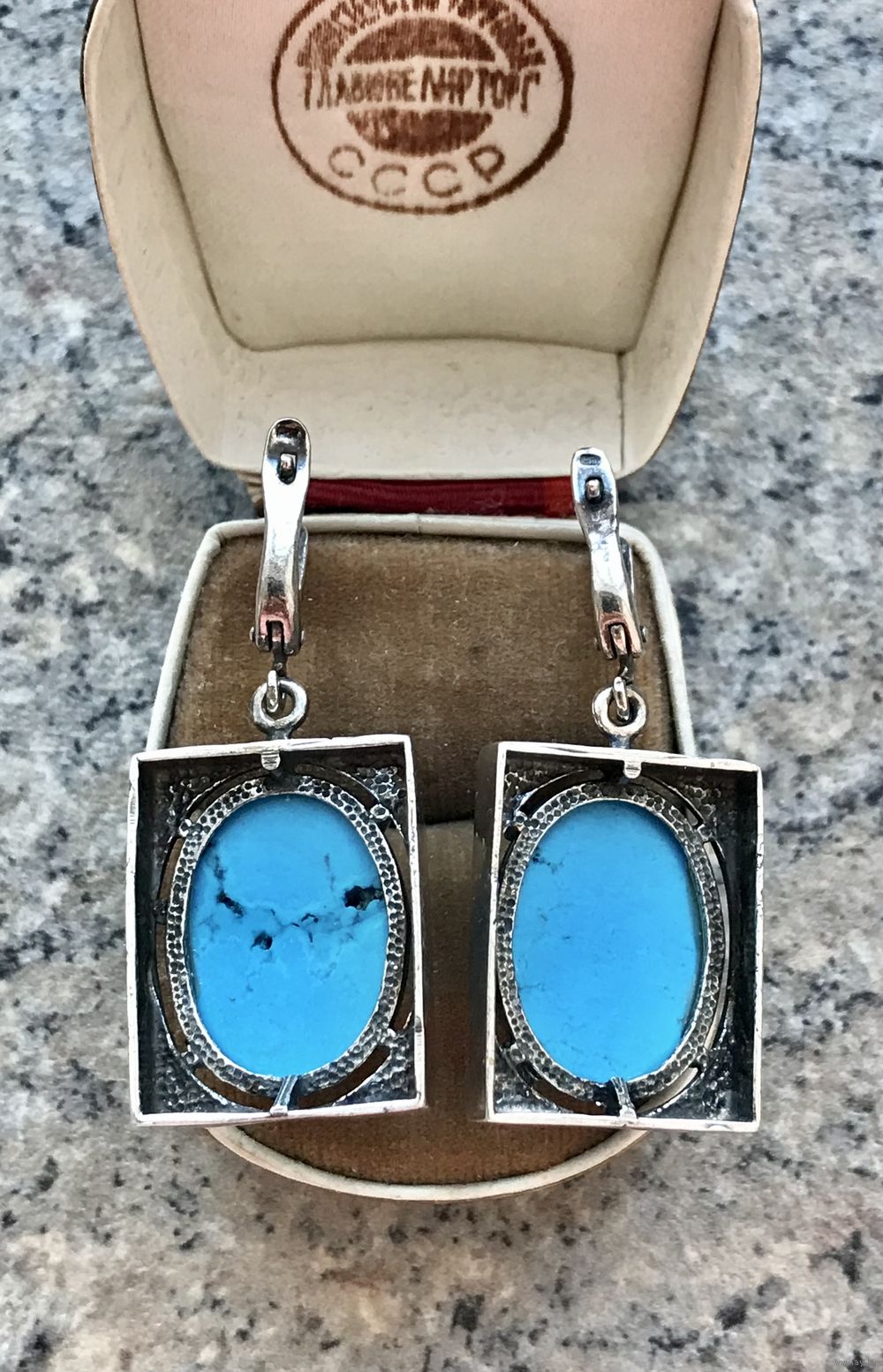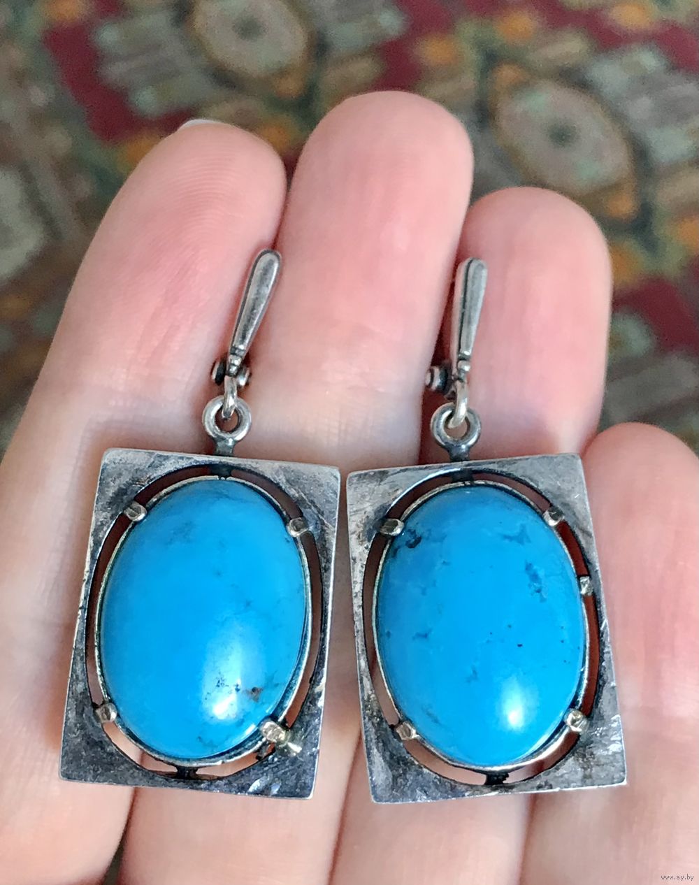 Крупные серьги с основой из металла с глубоким серебрением и вставок из синт.бирюзы (на одной вставке с обратной стороны есть отверстия, похожие на каверны). Высота серьги 4,5см., размер подвески 3х2см., размер вставки 2х1,5см.