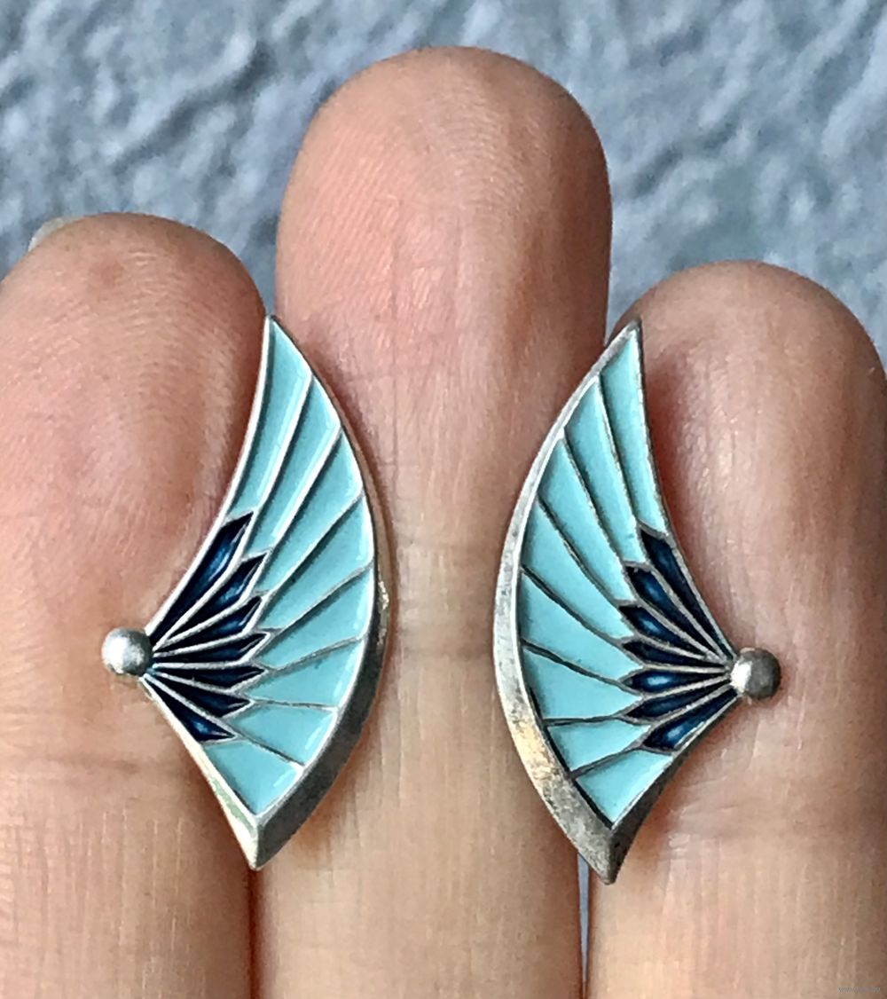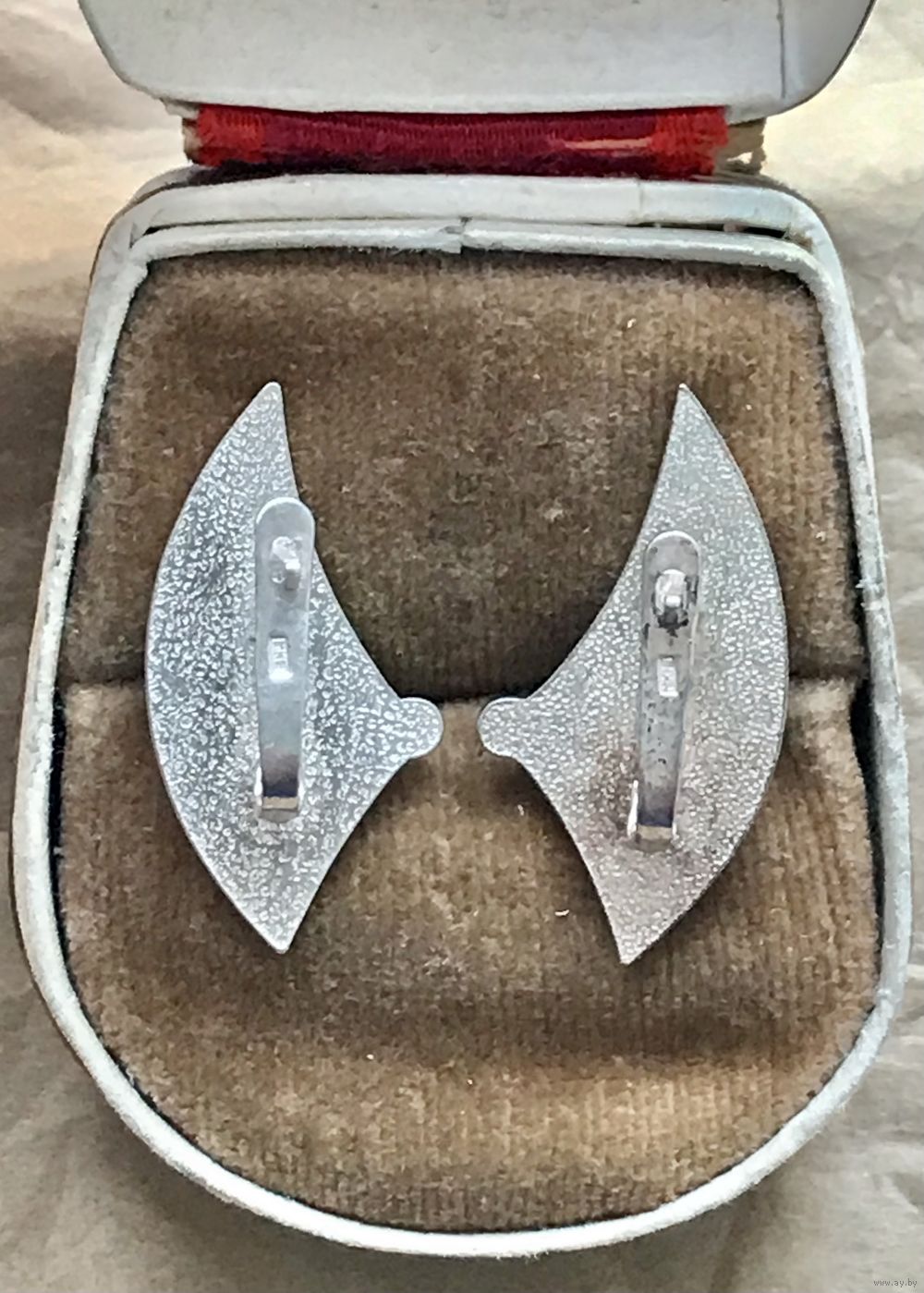 Винтажные серьги из мельхиора, лицевая сторона украшена эмалью. Высота серьги 2,7см., ширина 1,4см. Состояние хорошее.