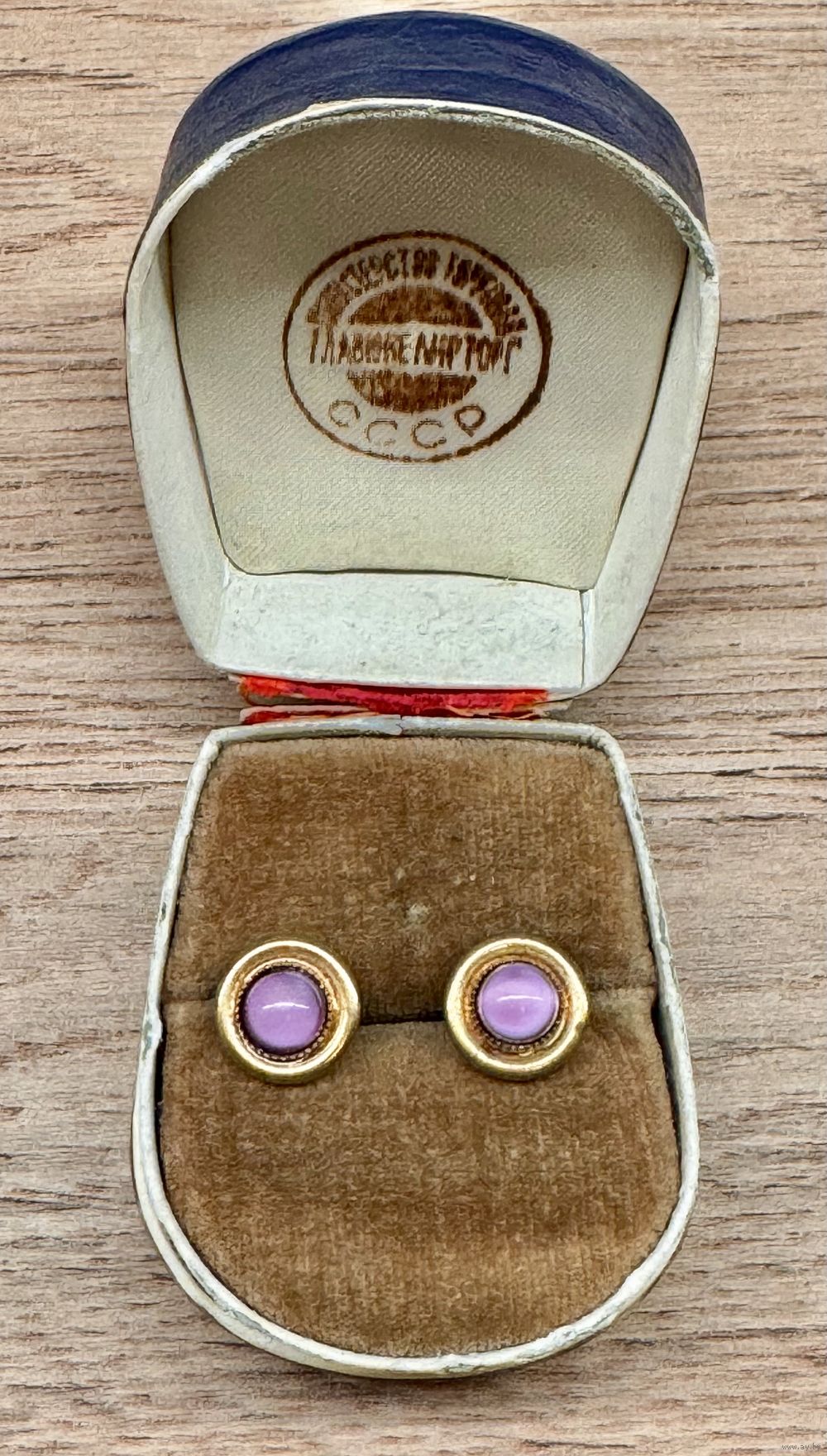 Небольшие винтажные серьги пусеты из латуни со вставкой из цветного стекла. Диаметр шляпки 1см. Состояние хорошее.