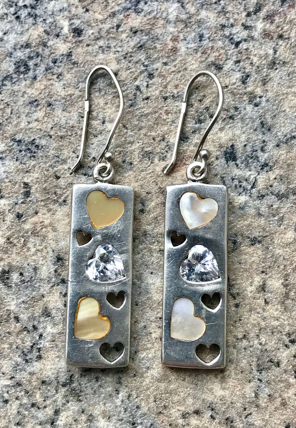 Серьги из серебра 925пр.(на швензах стоит пробирное клеймо с зубром и на обратной стороне каждой серьги отметка 925). Высота 4,6см., подвеска 3,1х0,9см., вставки из перламутра (на одной серьге немного отличаются по цвету) и кристаллов.