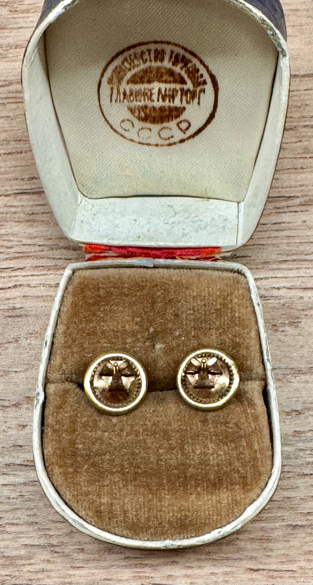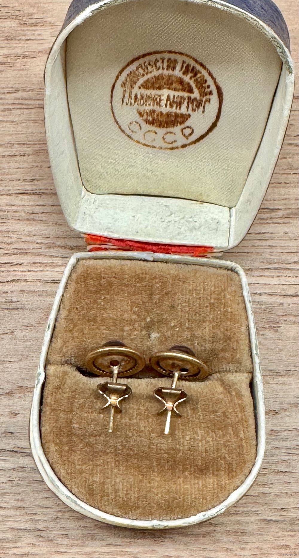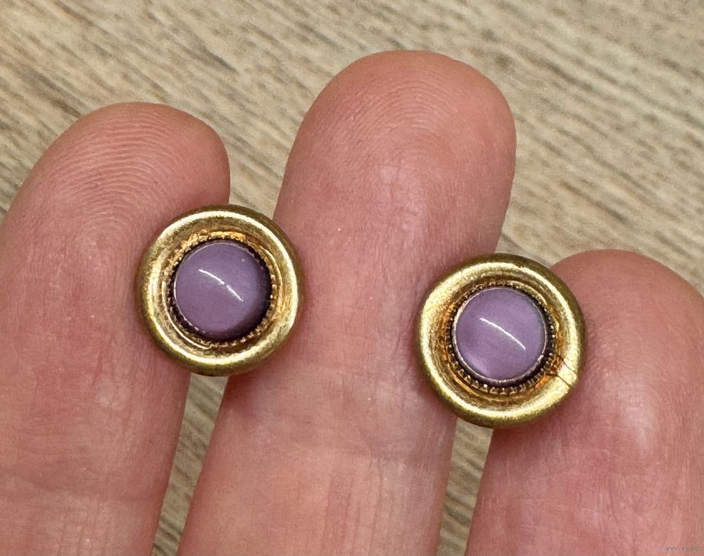 Небольшие винтажные серьги пусеты из латуни со вставкой из цветного стекла. Диаметр шляпки 1см. Состояние хорошее.