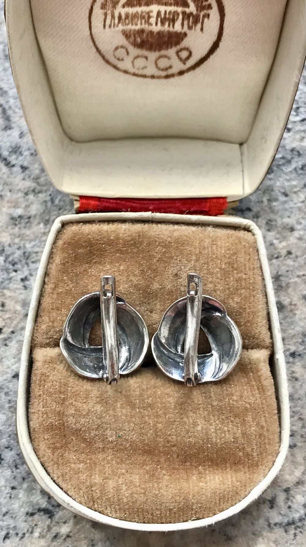 Небольшие серьги из мельхиора с серебрением, лицевая сторона украшена эмалью. На одной серьге есть незначительный скольчик эмали. Высота серьги 1,3см.