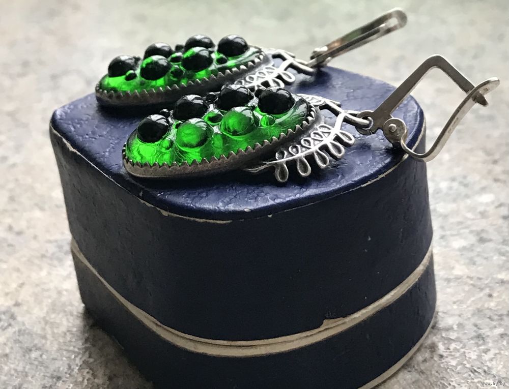 Винтажные крупные серьги с основой из мельхиора (клеймо) и вставками из цветного стекла. Высота серьги 4,5см, размер вставки 2,3х1,3см. Состояние хорошее.