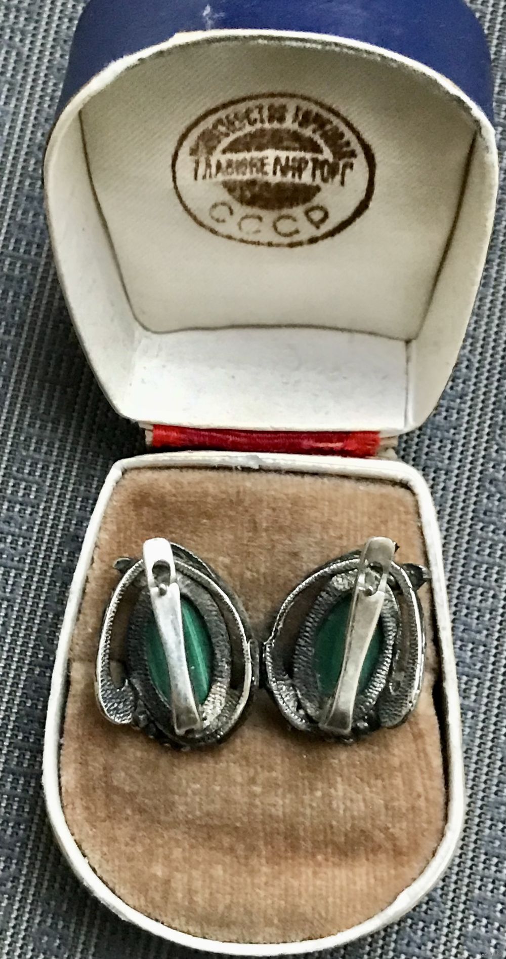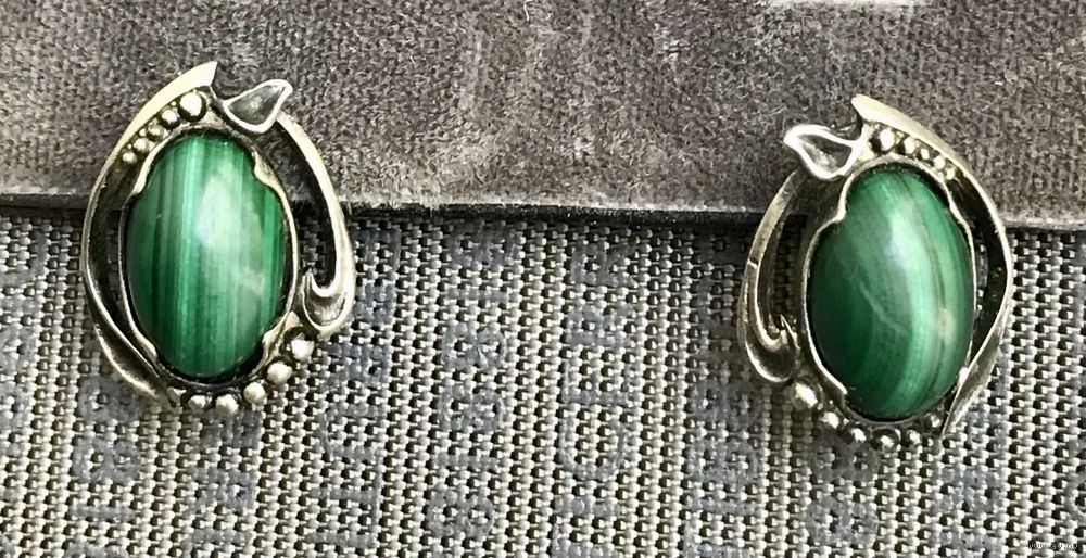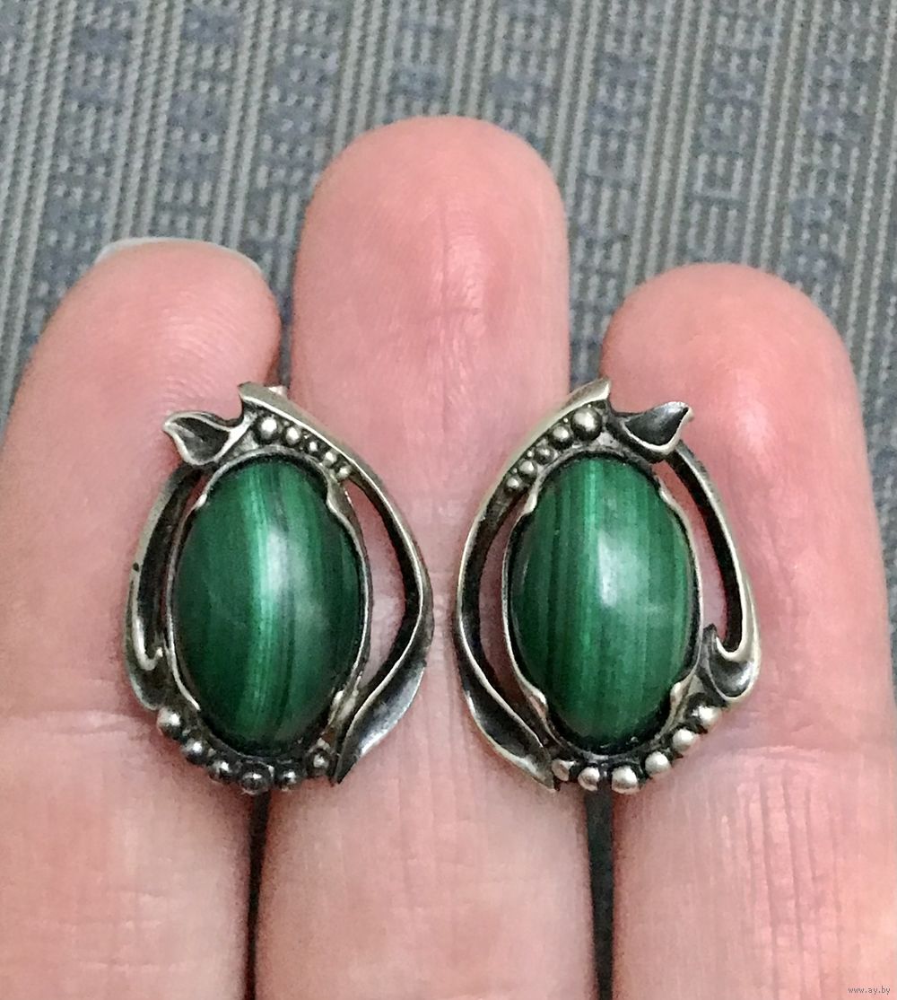 Серьги с основой из металла с глубоким серебрением и малахитовой вставкой. Размер серьги 2х1,5см. Состояние хорошее.