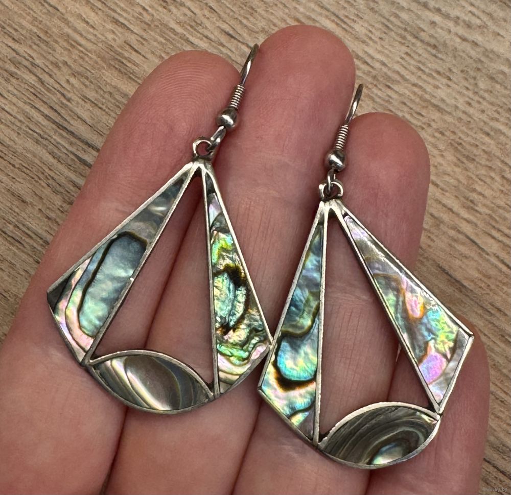 Крупные винтажные серьги с основой из сплава альпака, лицевая сторона украшена пластинами гелиотиса. Высота серьги с крючком 5,5см., размер подвесок +-3,5х3см.(подвески немного асимметричны). На одной серьге с обратной стороны стоит отметка Alpaca Mexico. Состояние хорошее.