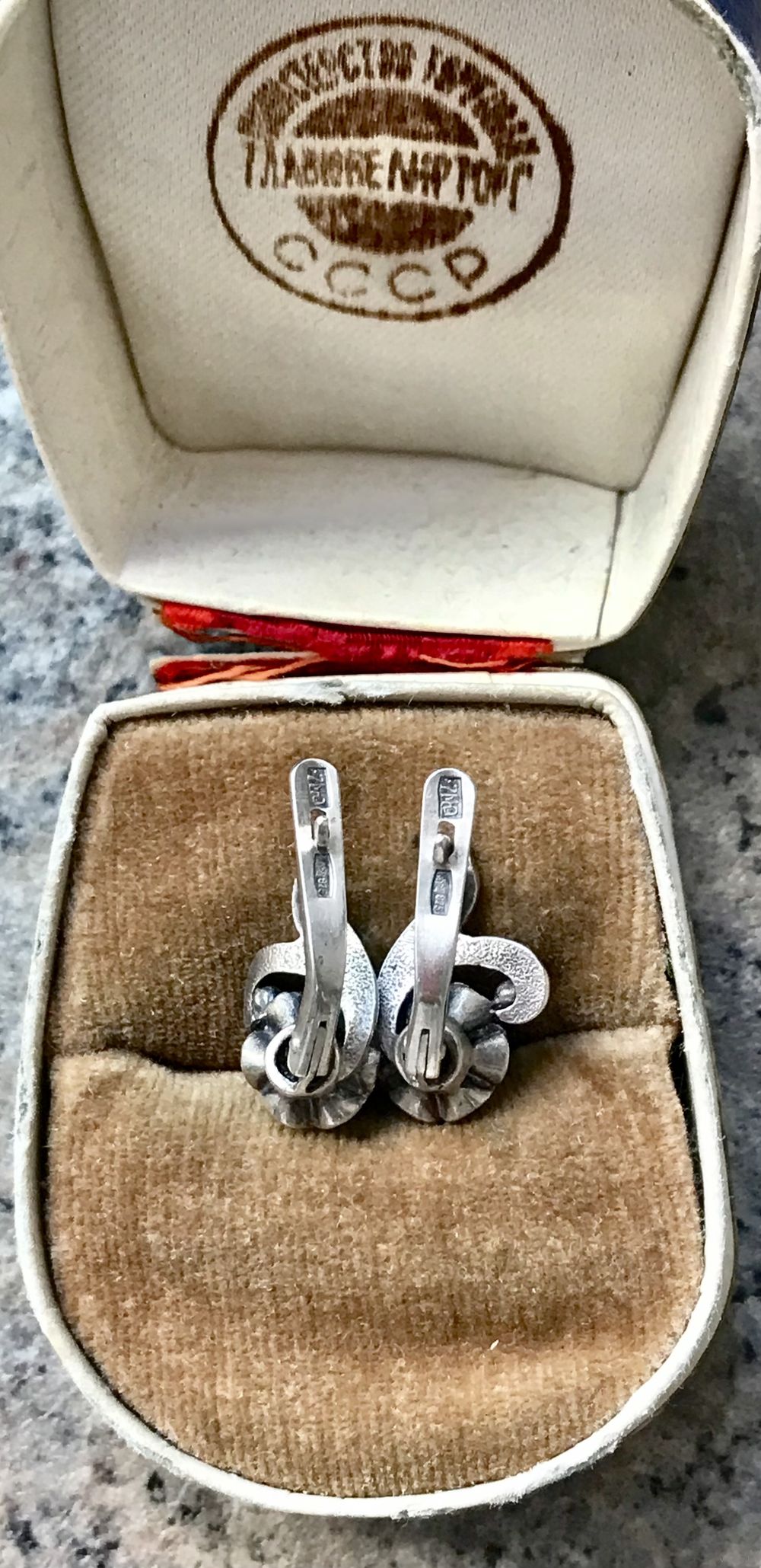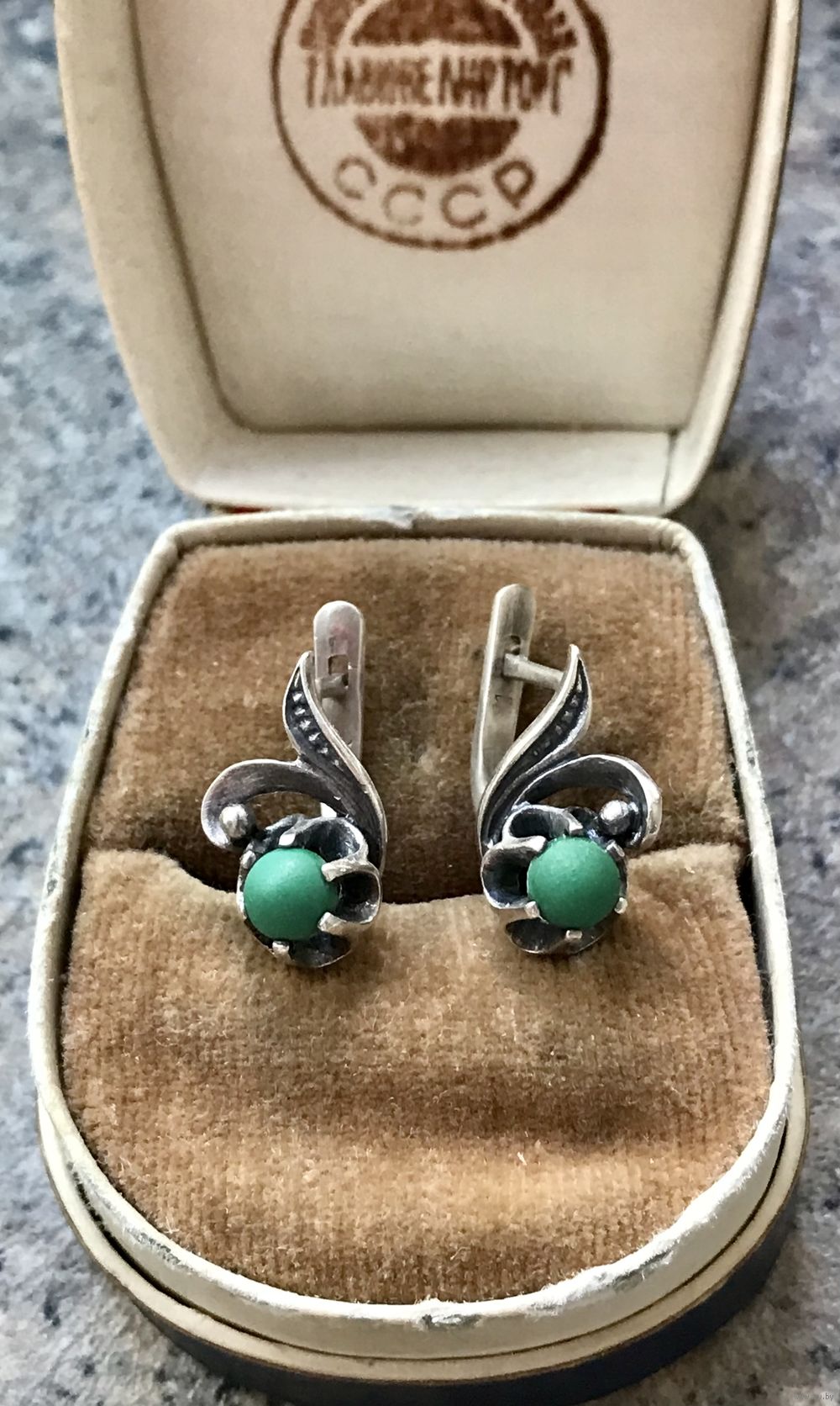 Серьги из серебра 875пр. со вставками из бирюзы. Сделаны в 1987г. в Москве (именник .7МЮ). Высота серьги 1,6см., вес пары 3,67гр.