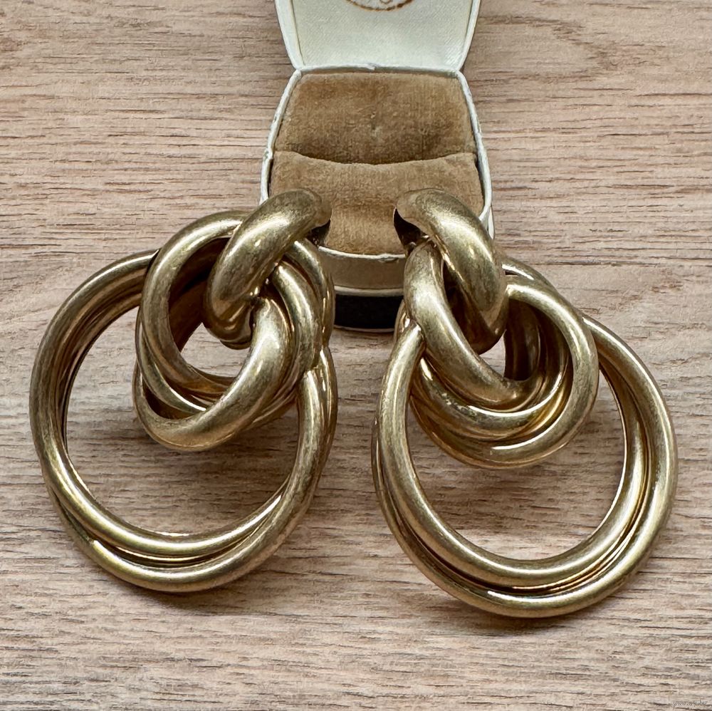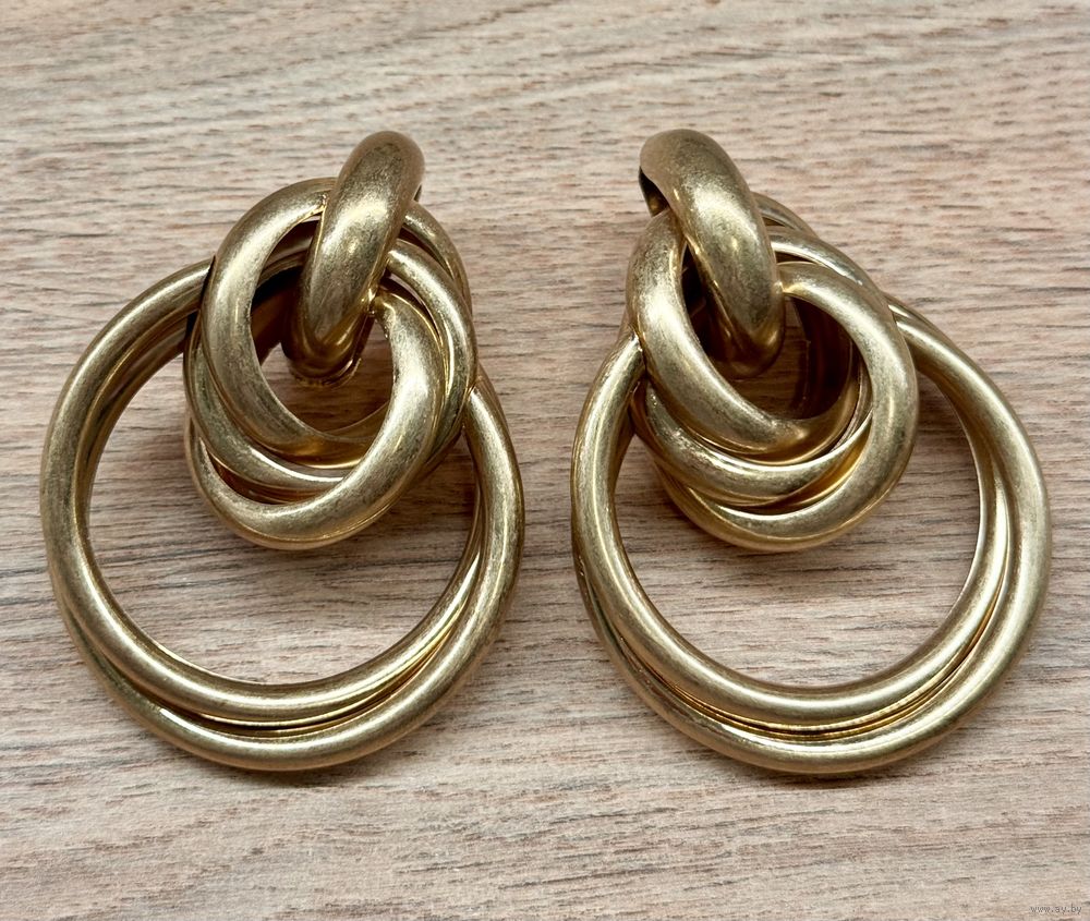 Крупные серьги-пусеты из металла золотого тона. Высота серьги 7см., ширина 5см. Состояние хорошее.