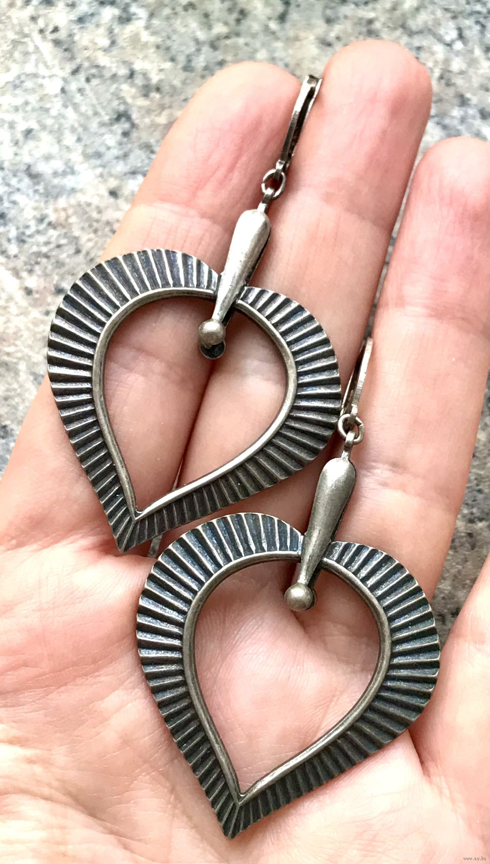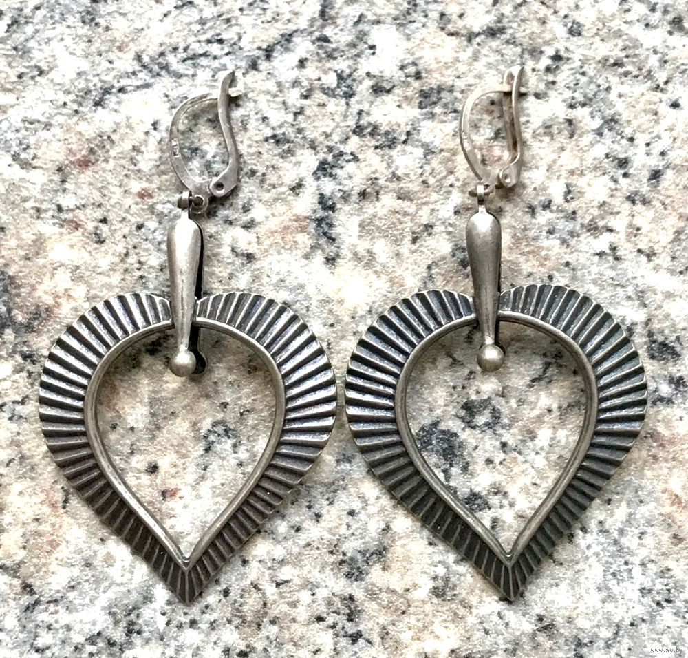 Винтажные крупные серьги из мельхиора (стоит клеймо). Высота со швензой 6,5см., размер подвески-сердца 3,5х3,5см. Состояние хорошее.