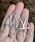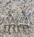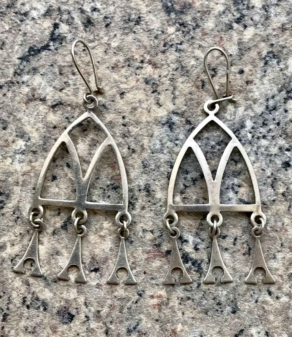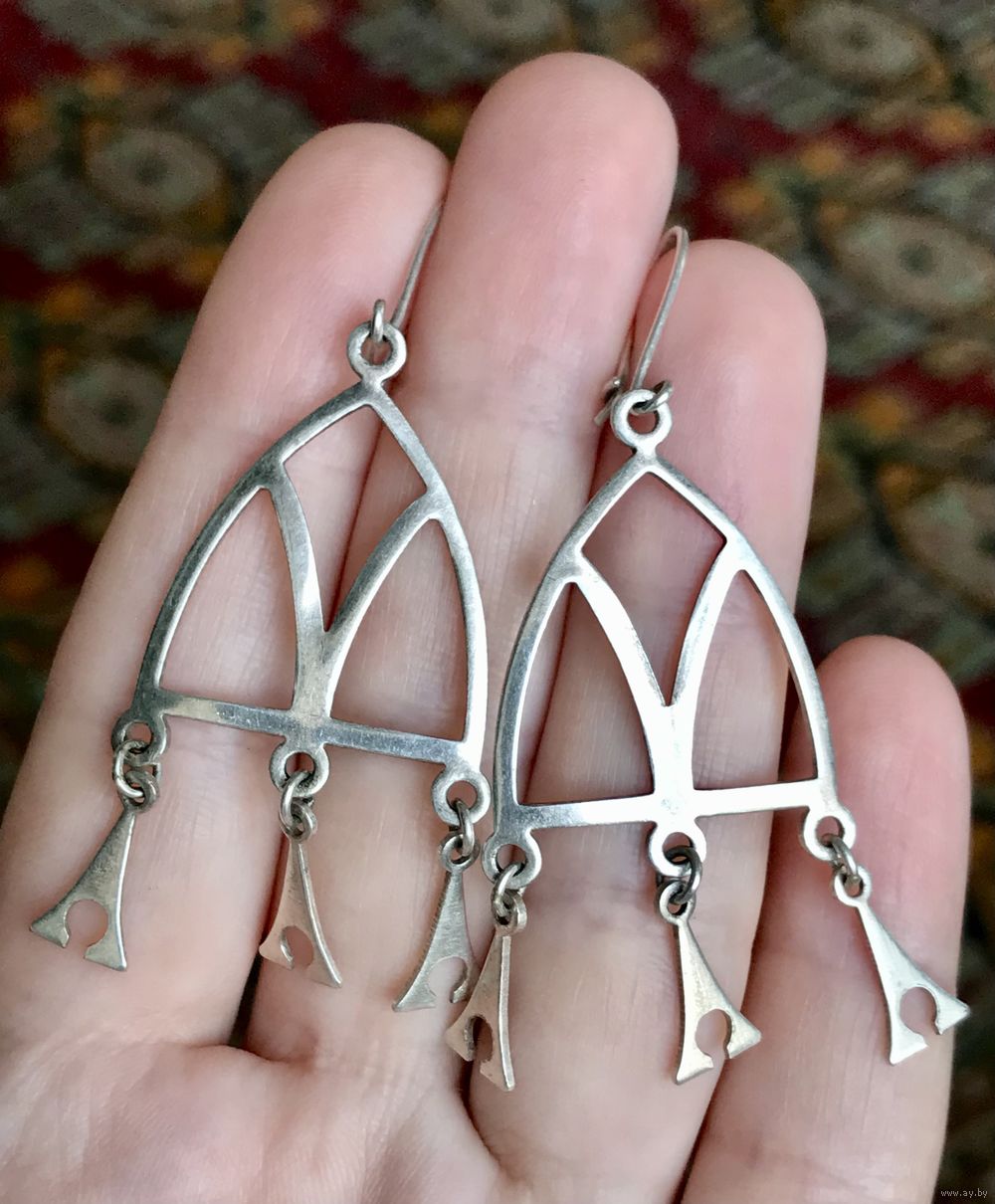 Серьги из металла серебристого тона (мельхиор?серебрение?, стоит клеймо). Высота с висюльками 6см., размер подвески 4,5(с висюльками)х2,5см. Состояние хорошее.