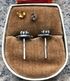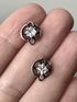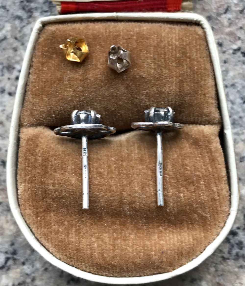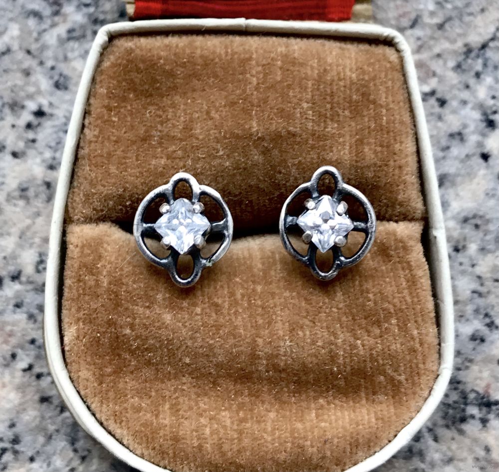 Серьги-пусеты из мельхиора и вставок из стекла. Размер лицевой части 0,9х1см. Один зажим не родной. Общее состояние хорошее.
