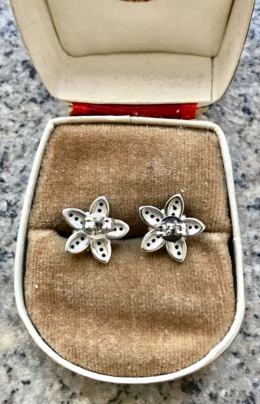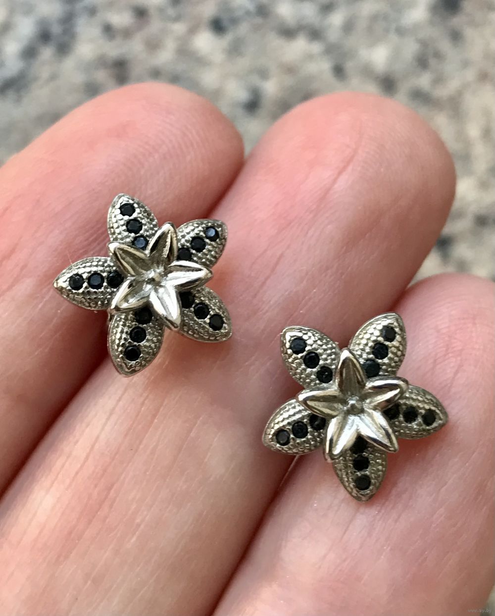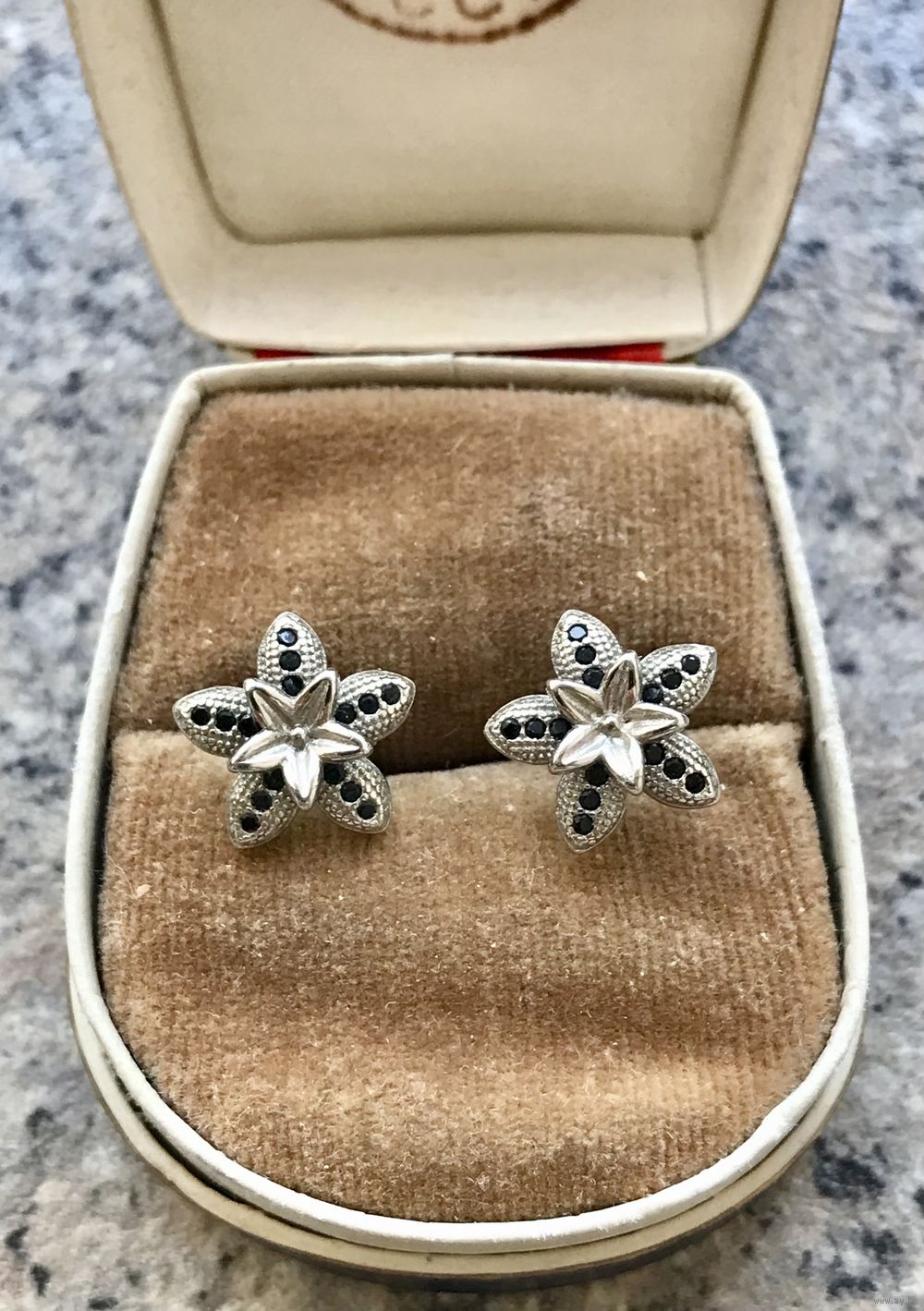 Серьги из металла с серебрением и вставок из мелких кристаллов чёрного цвета. Размер цветочка 1,2х1,2см. Состояние хорошее.