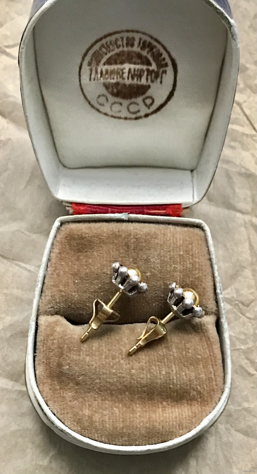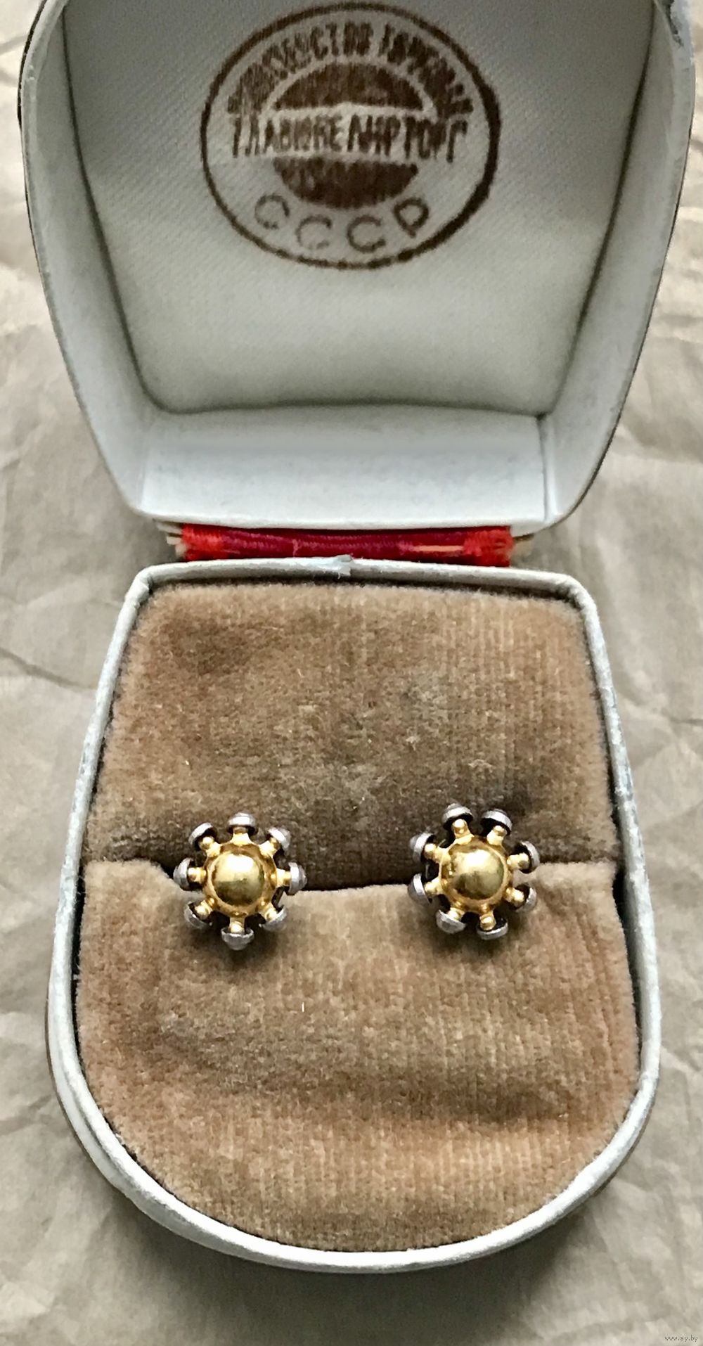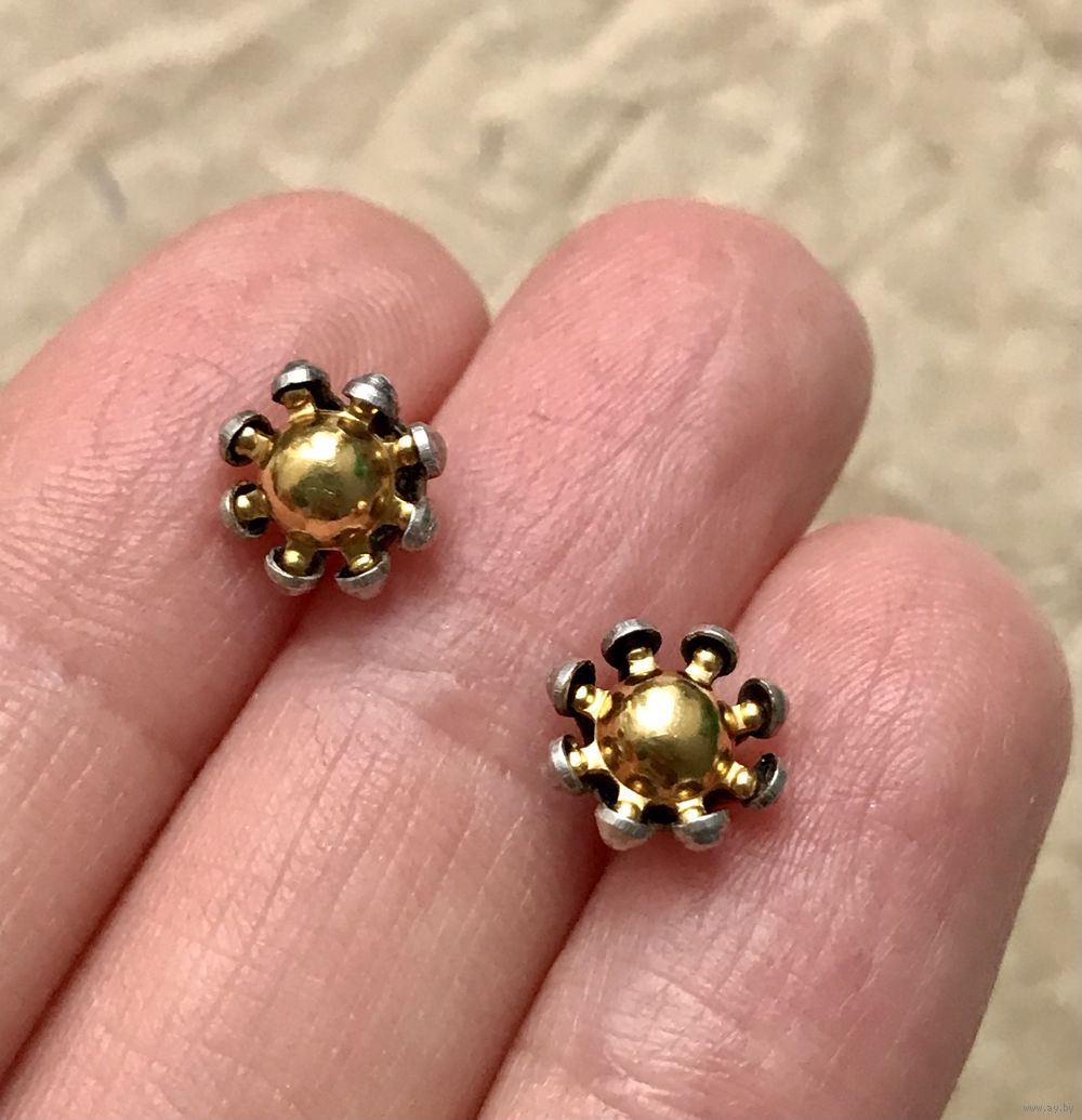 Винтажные серьги-пусеты из мельхиора с позолотой. Изготовлены в 80-х годах в СССР на Приволжском юв.заводе. Диаметр шляпки 1см. Состояние хорошее.