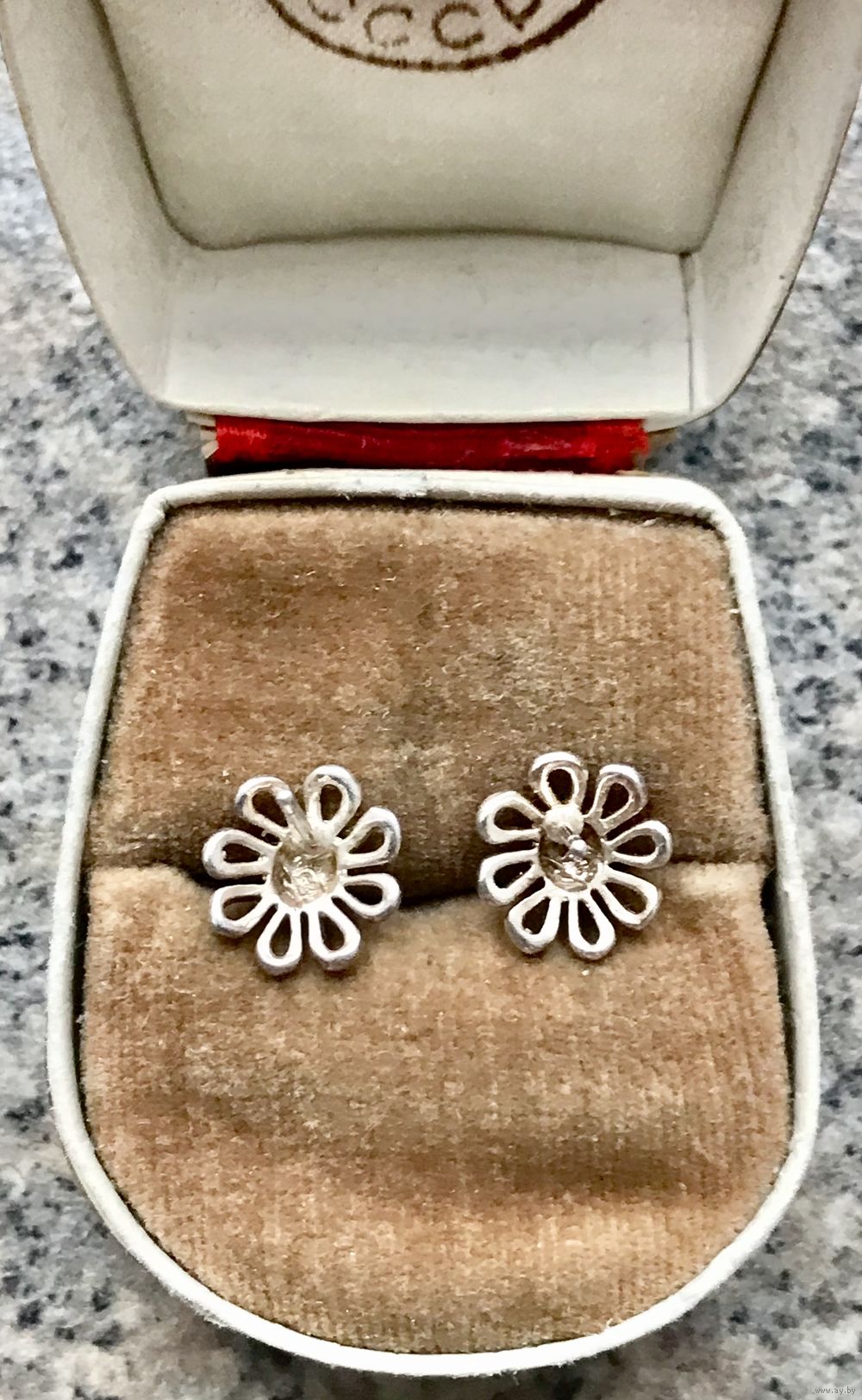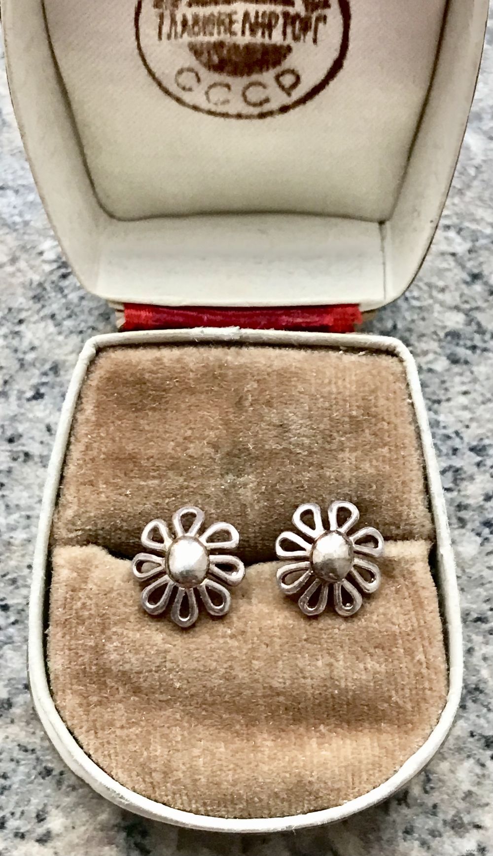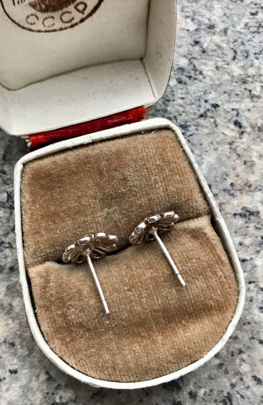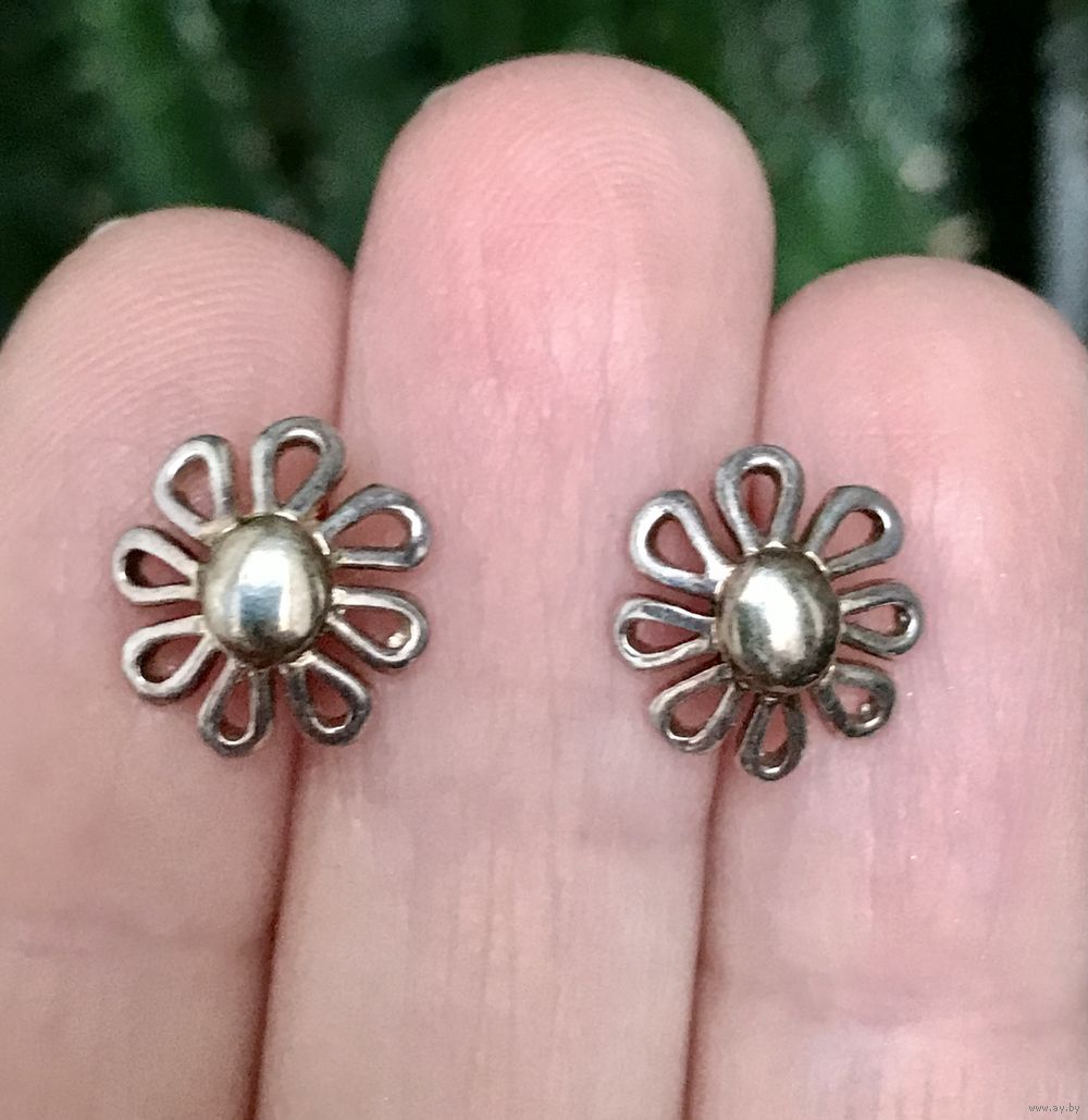 Серьги-пусеты из серебра 925пр.(отметки стоят на обратной стороне каждой шляпки и на ножках). Размер цветочка 1,1х1см. Утеряны зажимы, прилагаю силиконовые. Вес 1,77гр. Состояние хорошее.