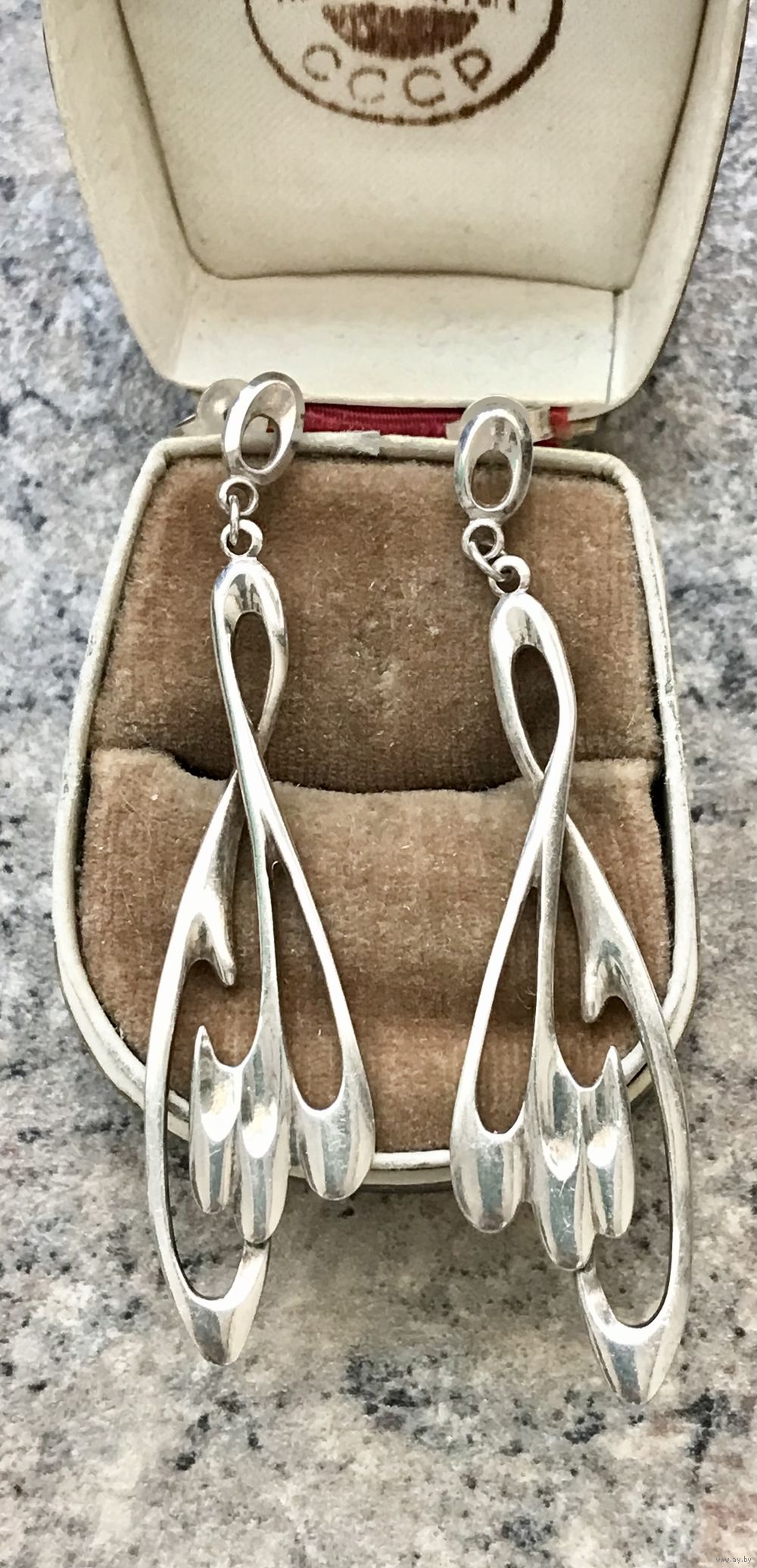 Серьги-пусеты из серебра 925пр.(звезда). Сделаны в 1991г. в Таллине, автор модели Тамара Сергиенко. Высота серьги 6,5см., вес пары 7,75гр. Состояние хорошее.