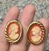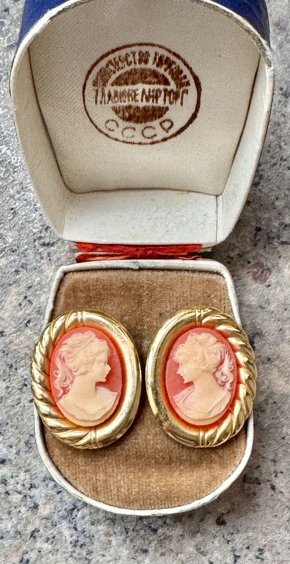 Винтажные серьги-пусеты с основой из латуни, на лицевой стороне камея из пластика. Размер серьги 2,7х2см. Состояние хорошее.