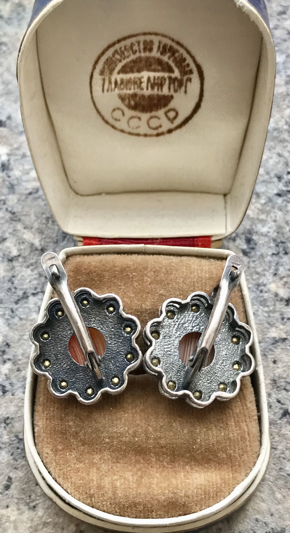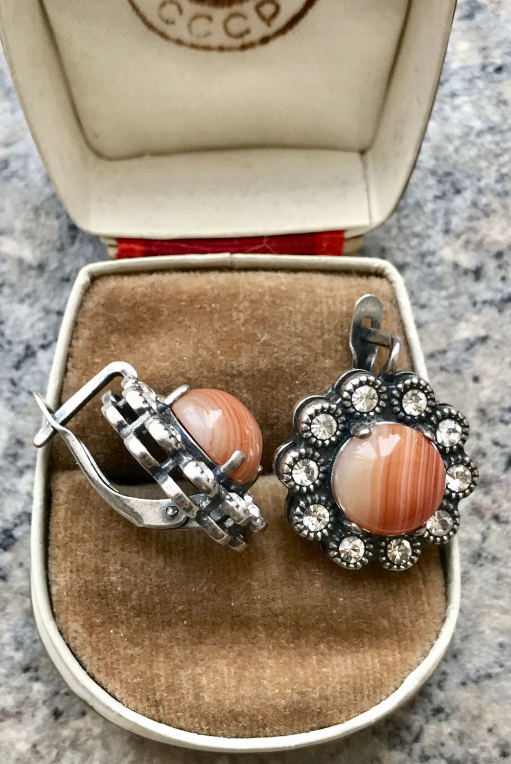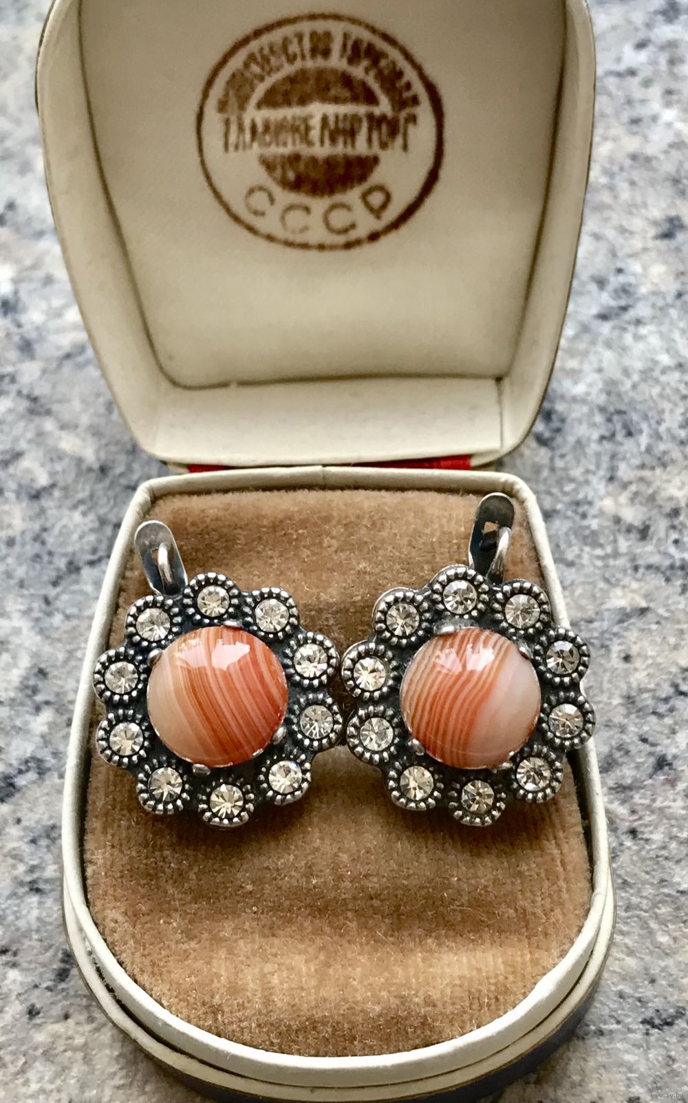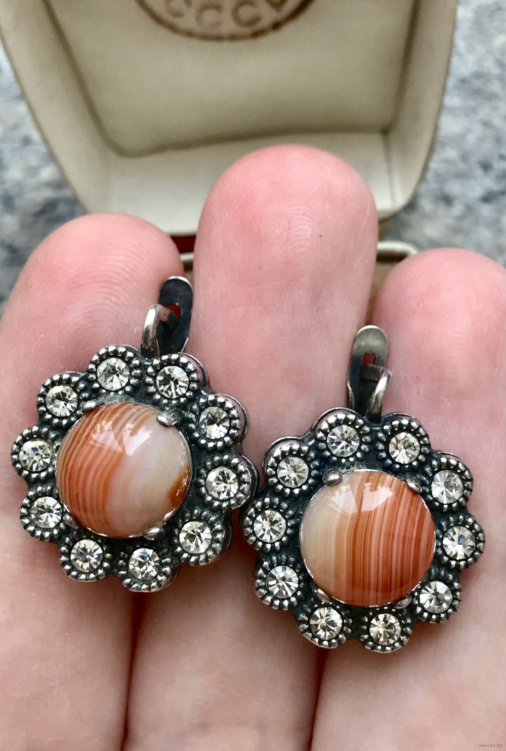 Эффектные крупные (высота 2,3 см., диаметр 2см.) серьги из металла с серебрением (стоит отметка), вставки кристаллы и кабошоны из художественного стекла диаметром 1см. Состояние хорошее.