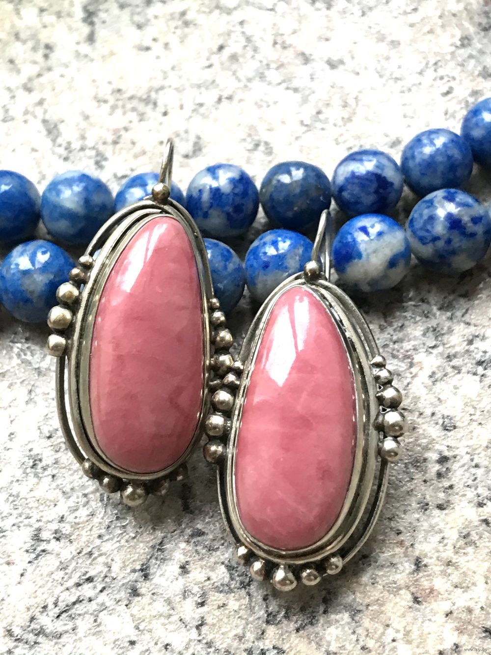 Крупные винтажные серьги из мельхиора со вставками из родонита. Высота серьги 4,3см., высота вставки 2,8см. Состояние хорошее.