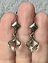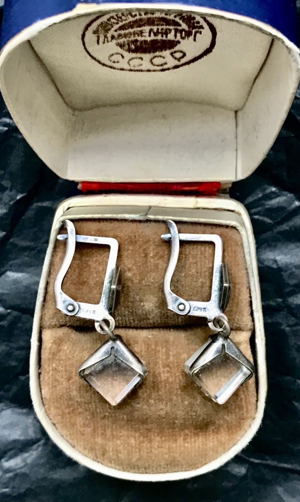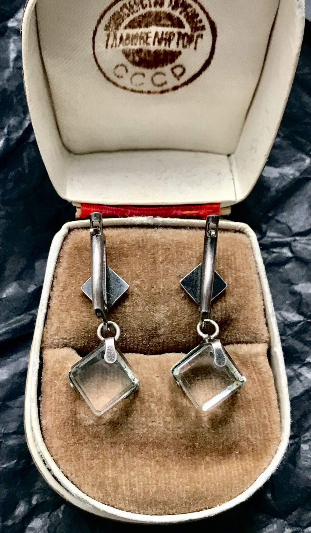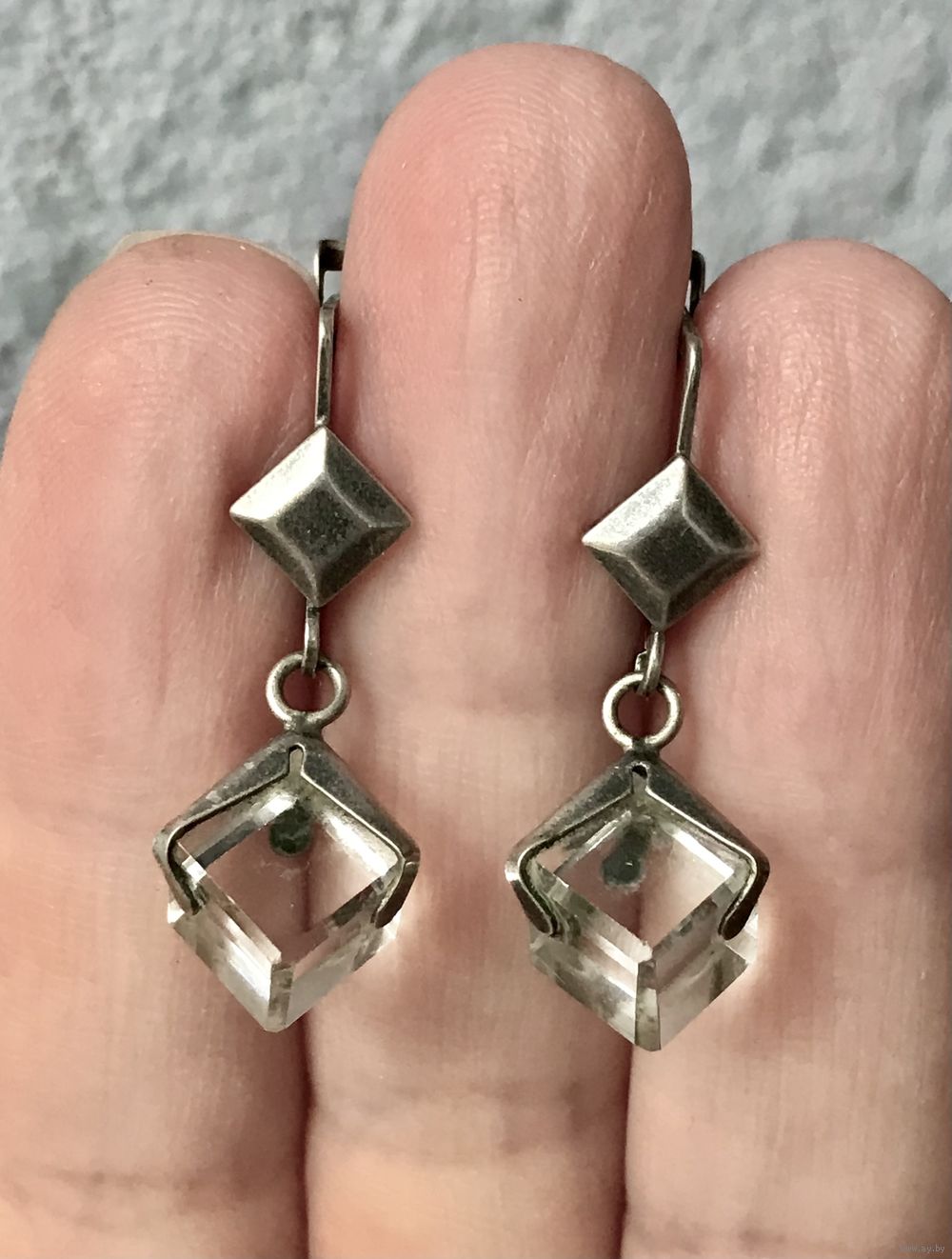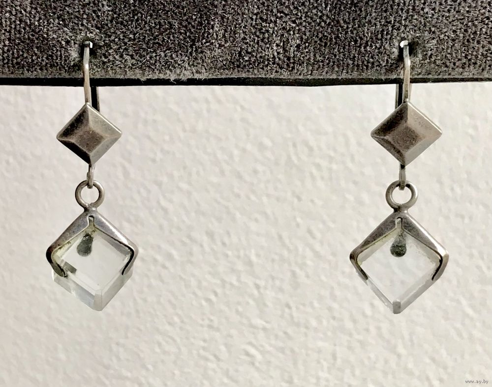 Винтажные серьги с основой из мельхиора, в подвесках вставки из кварца. Высота серьги 3см., размер вставки 0,6х0,6см. Состояние хорошее.